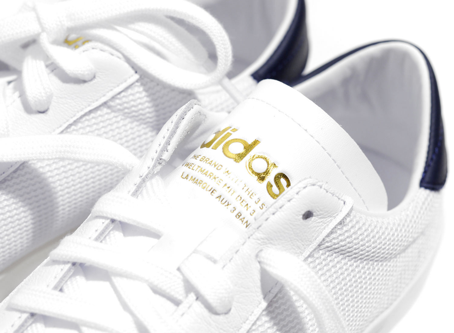 ADIDAS ORIGINALS Courtvantage White / Navy. Jolie Tennis au look retro. Empeigne Mesh et cuir avec talon cuir contrasté. Logo Adidas Original doré embossé sur la languette.