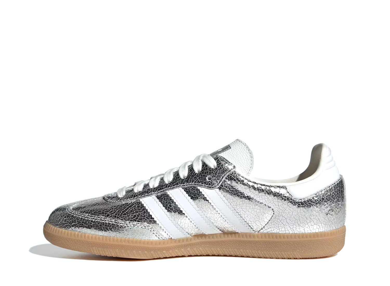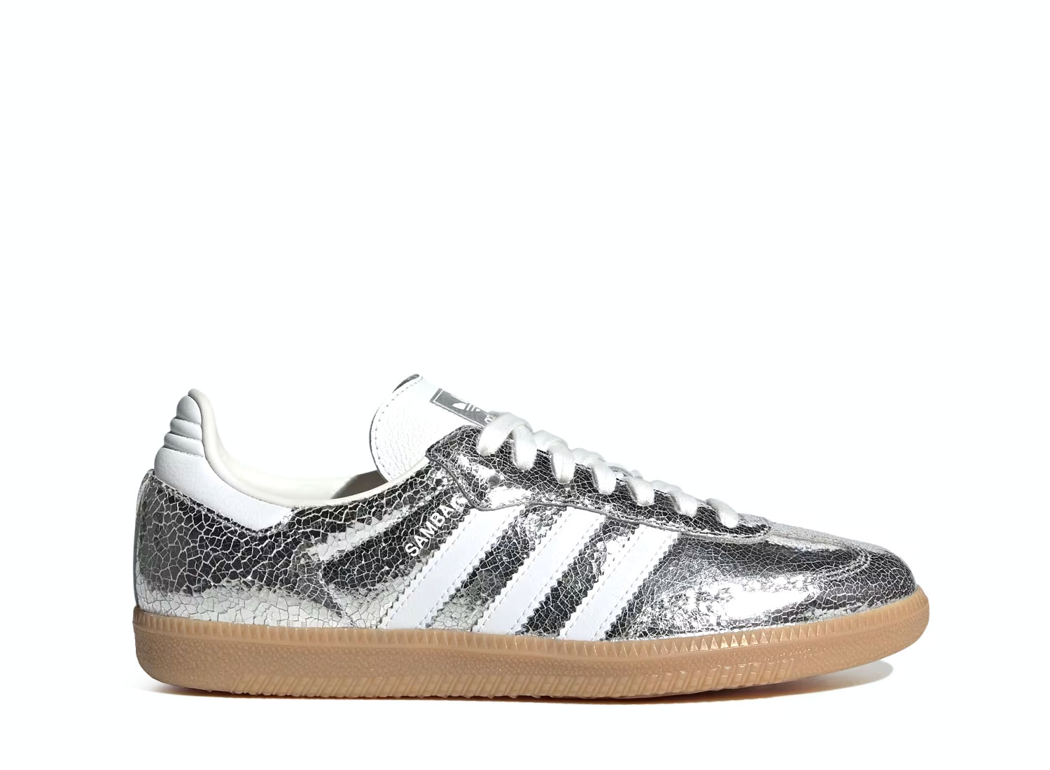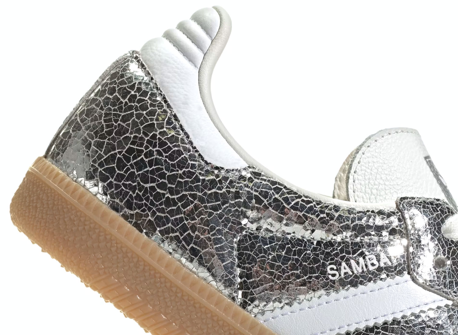 ADIDAS ORIGINALS Samba OG Silver Metallic / Cloud White / Core White JR0035. L'iconique SAMBA OG fait son retour dans une version silver ! Mélange de cuir synthétique brillant effet craquelé et cuir. Look vintage, semelle gomme.