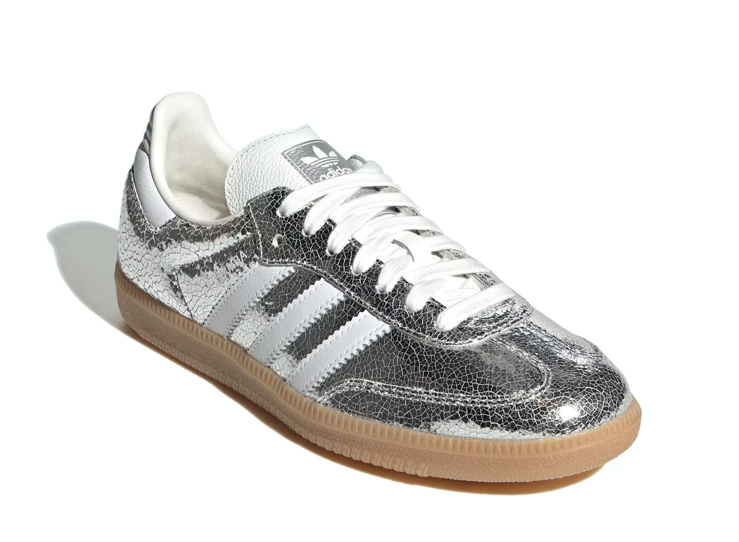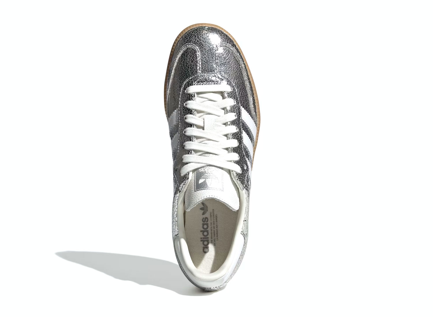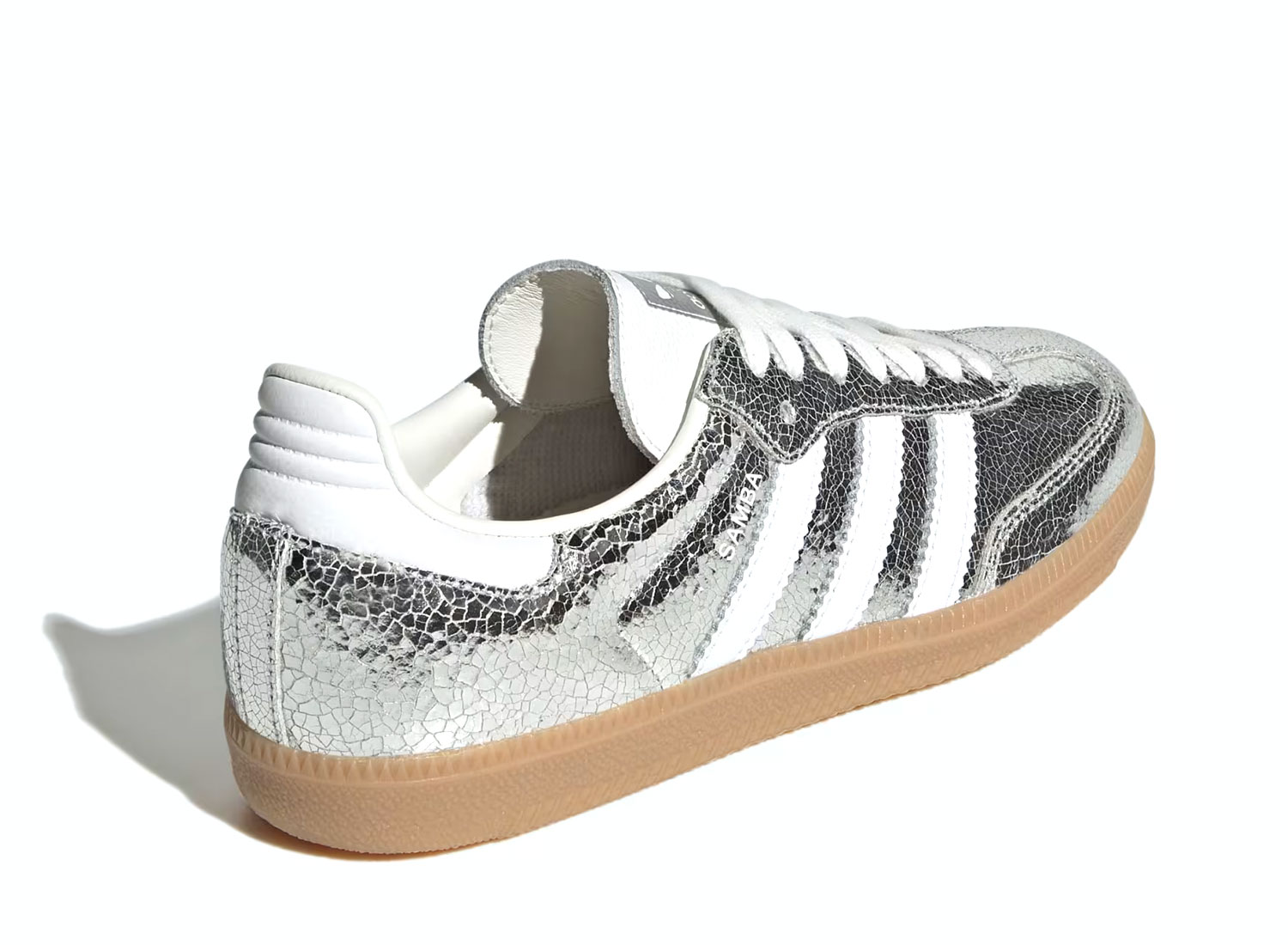 ADIDAS ORIGINALS Samba OG Silver Metallic / Cloud White / Core White JR0035. L'iconique SAMBA OG fait son retour dans une version silver ! Mélange de cuir synthétique brillant effet craquelé et cuir. Look vintage, semelle gomme.