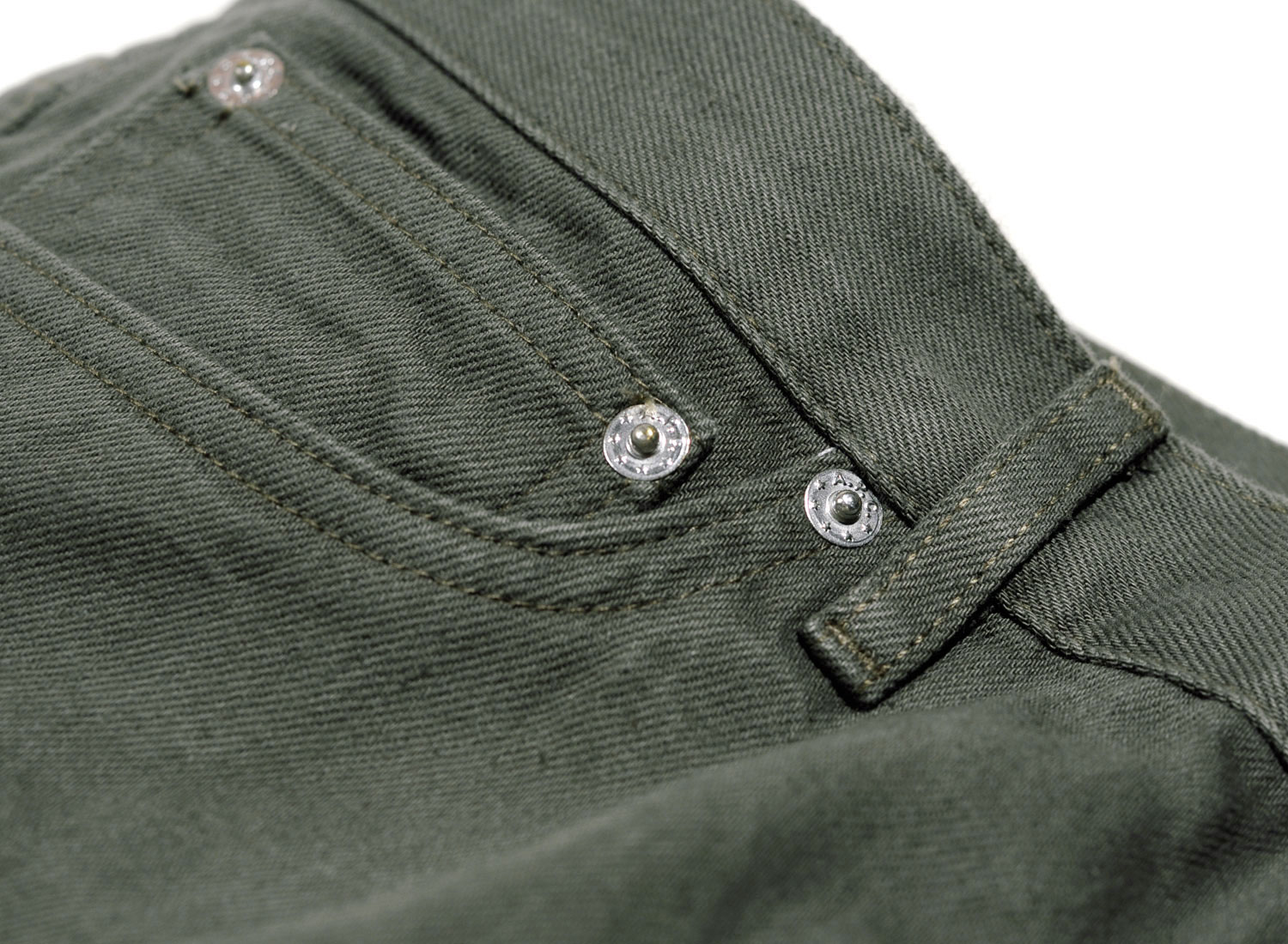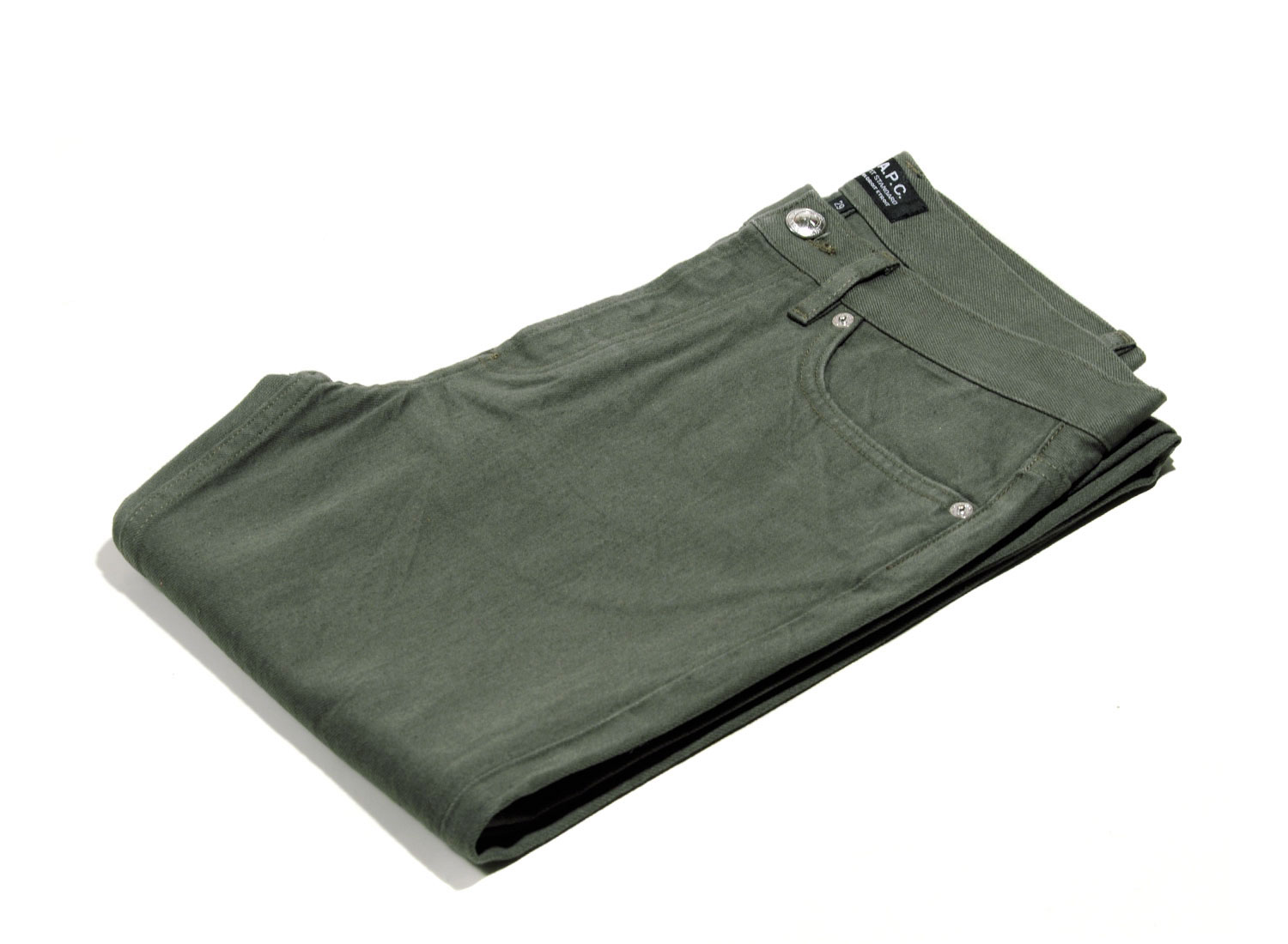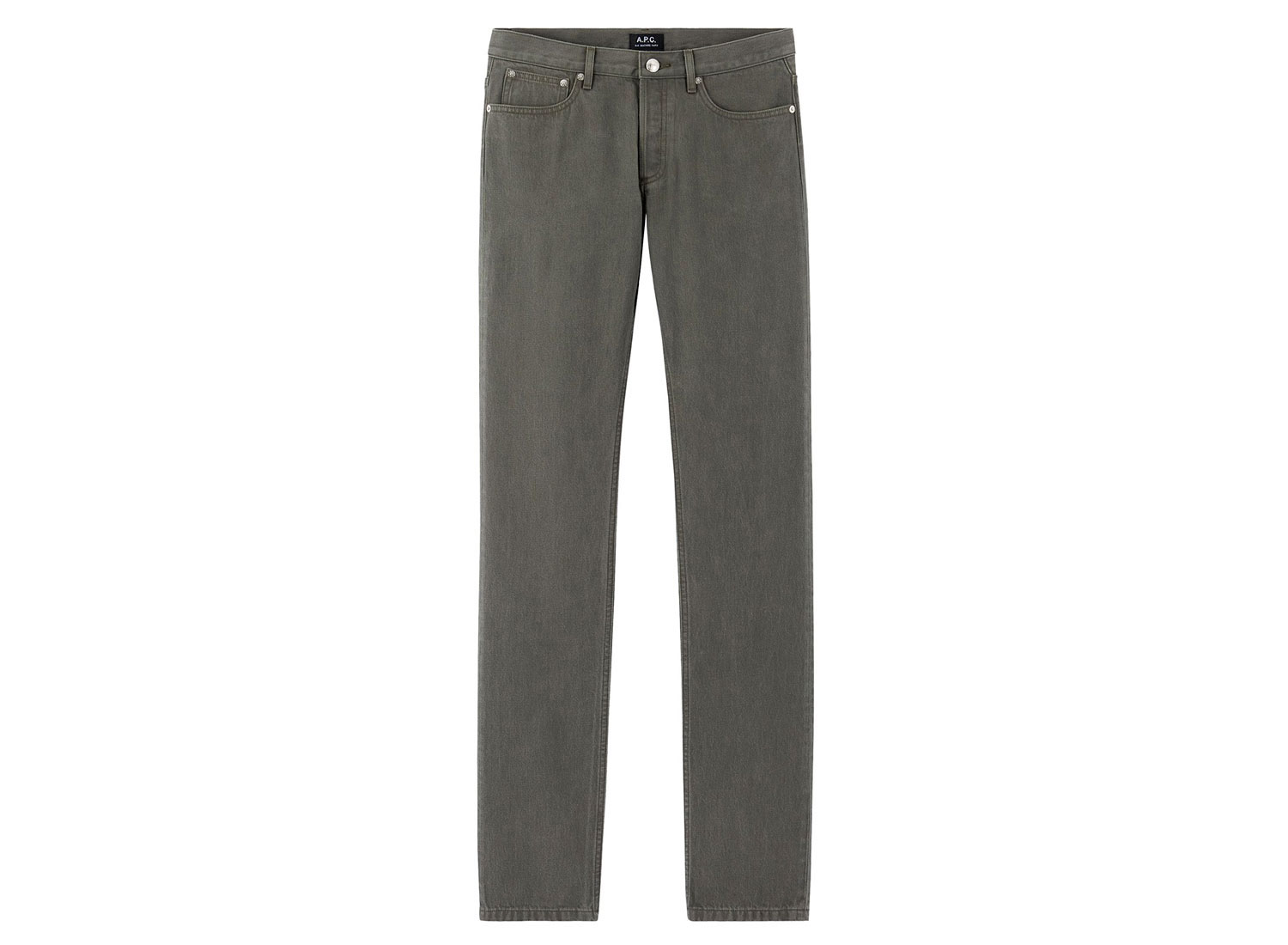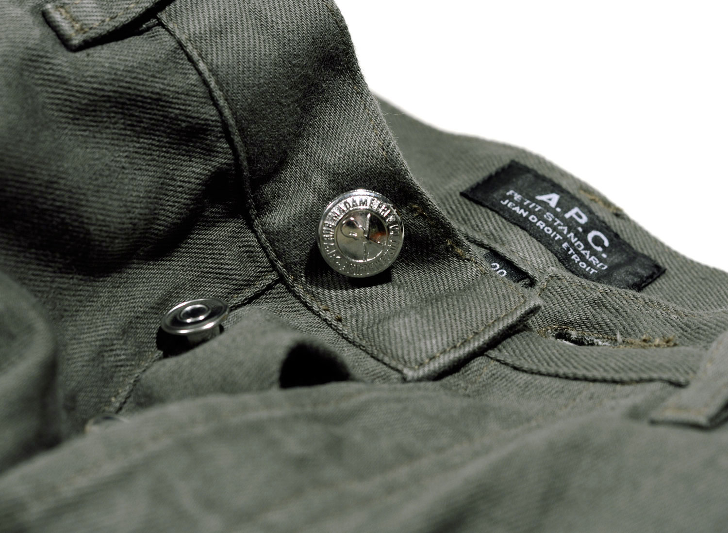 APC Petit Standard Kaki. Denim surteint japonais. Jambe droite et ajustée. Taille basse et droite. Cinq poches. Braguette boutons, le premier gravé ''A.P.C. rue Madame près du Luxembourg''. Rehausse jean au dos. Surpiqûres ton sur ton. Rivets métalliques gravés.