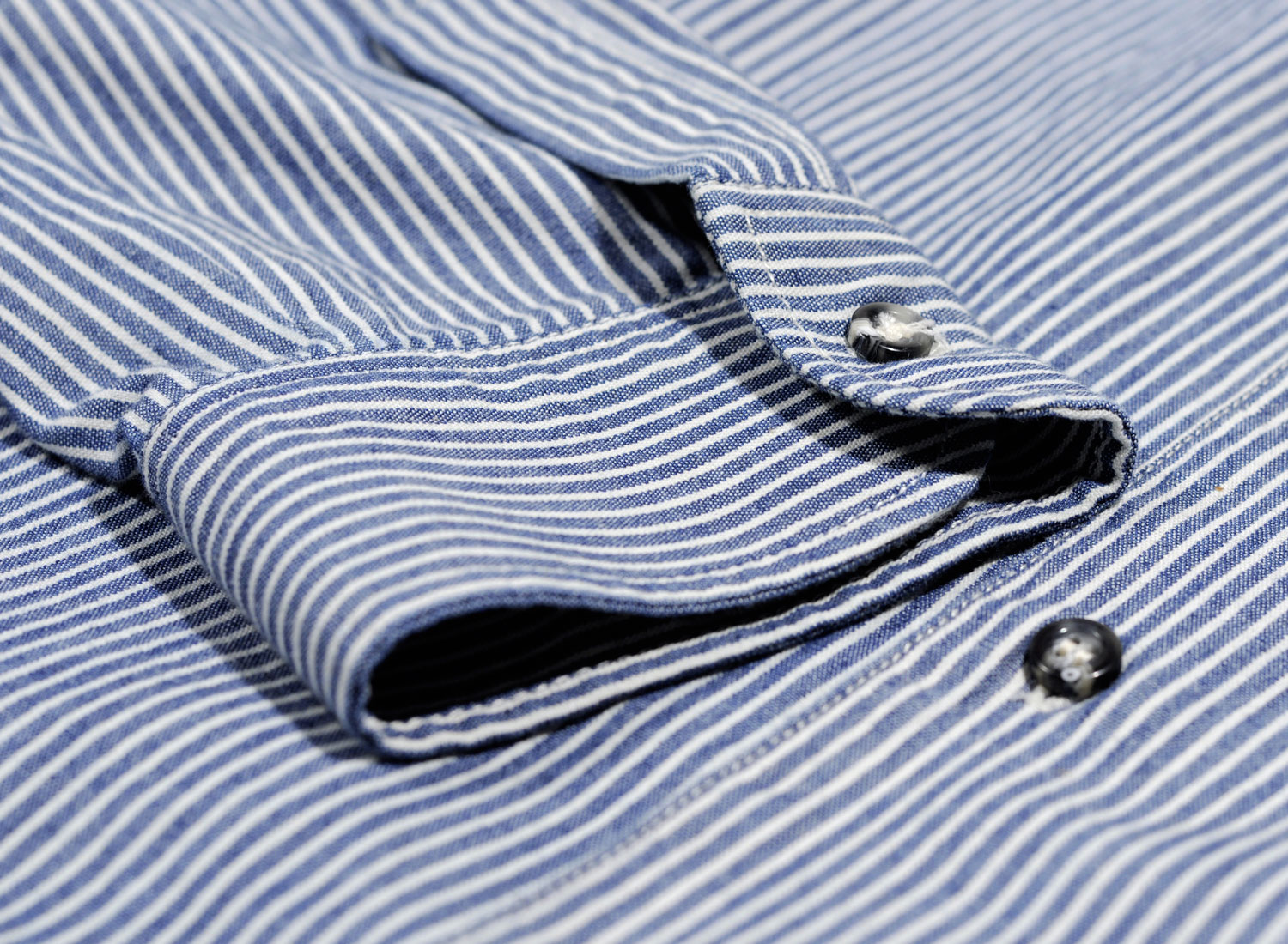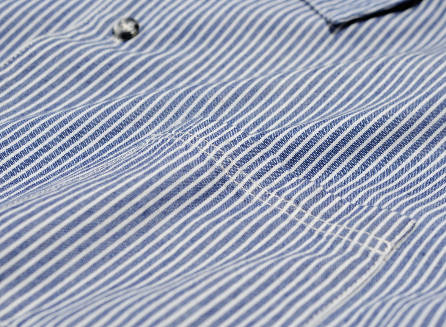 APC Surchemise Luca Indigo. Coutil de coton japonais. Coupe droite. Col vareuse classique. Empiècement demi-lune et languette d'accroche dans la nuque. Fermeture boutonnée. Six boutons dont un à bride sous le col. Poche poitrine arrondie plaquée surpiquée. Empiècement en haut du dos. Fentes latérales en bas. Manches longues montées. Pli et fente en bas des manches. Poignets boutonnés. Bas droit. Non doublée. Ourlet surpiqué. Boutons effet corne.