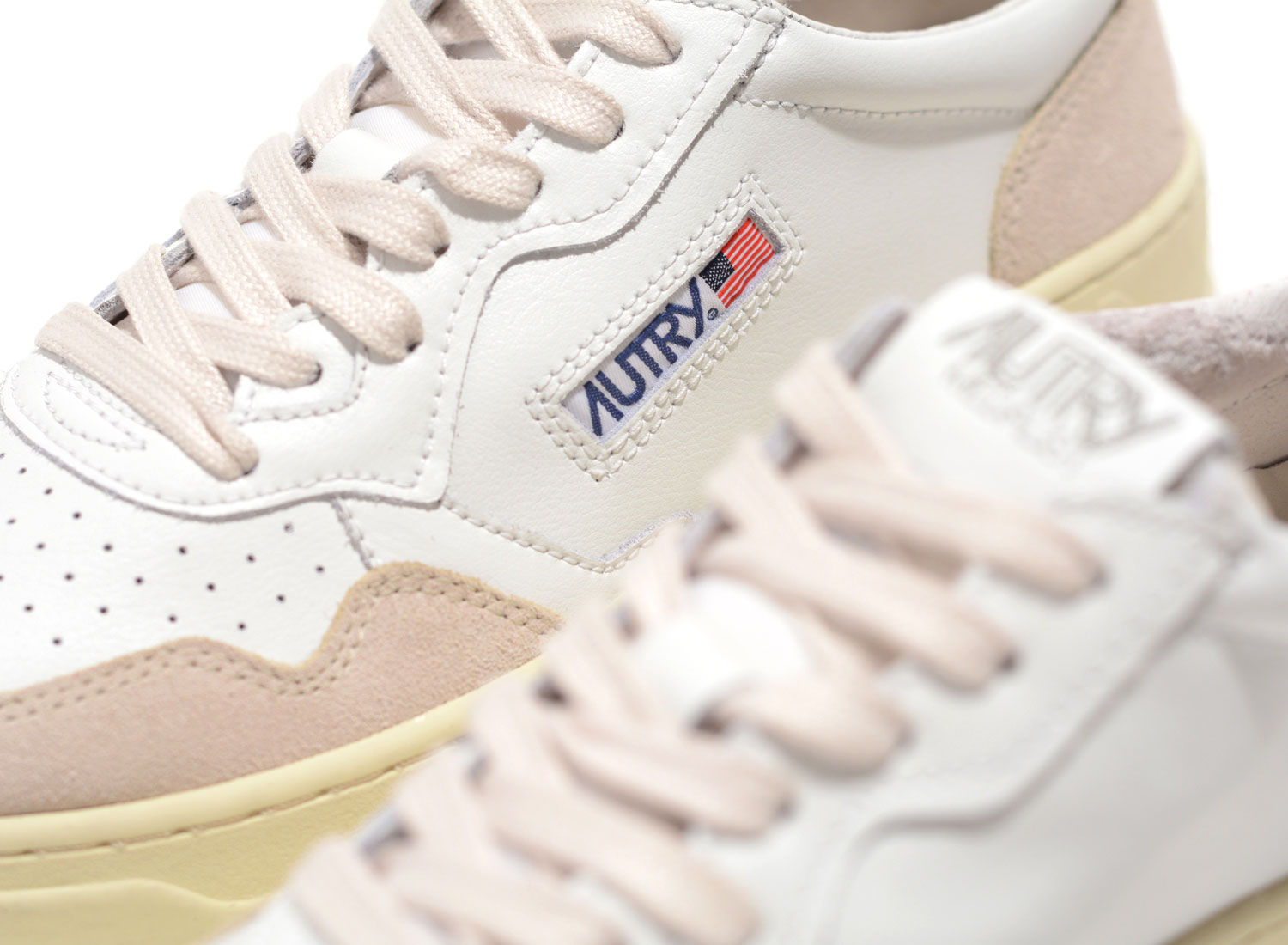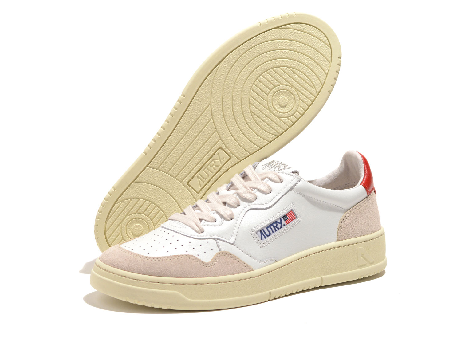 AUTRY 01 Low LS43 Suede White / Red. Réédition de la tennis historique 01. Empeigne en cuir premium et daim. Semelle et lacets vanille pour un look vintage. Ultra confortable.