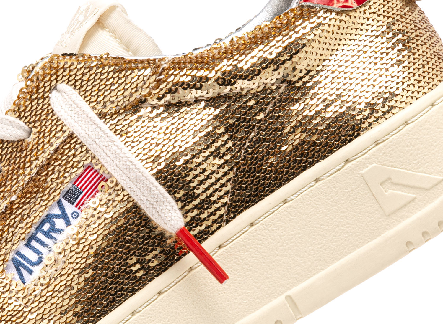 AUTRY Dallas Low ADLW TI03 Wom Paillet / Platinum / Red. "SAY IT WITH FLOWERS" CAPSULE COLLECTION. Réédition de la tennis DALLAS dans un version très limitée. Empeigne en sequin et arrière contrasté.
