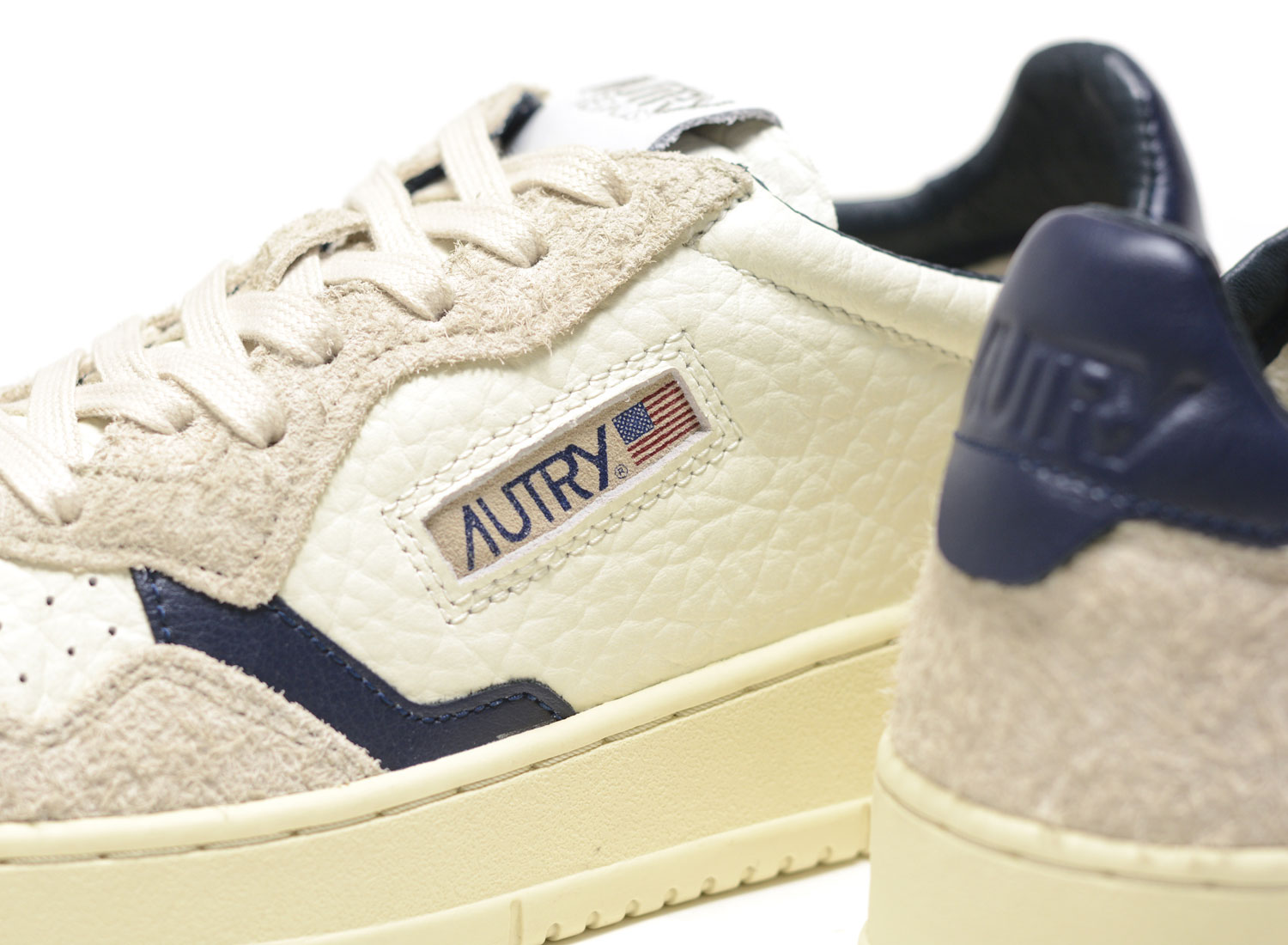 AUTRY Medalist Low HE02 Hairy Effect Suede White / Sand / Space. Réédition de la tennis historique 01. Empeigne bimatière en cuir texturé et hairy suede. Semelle et lacets vanille pour un look vintage. Ultra confortable.