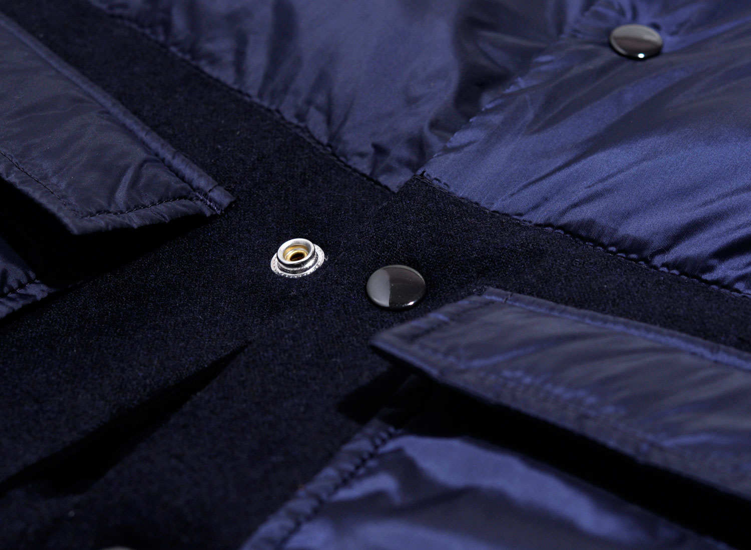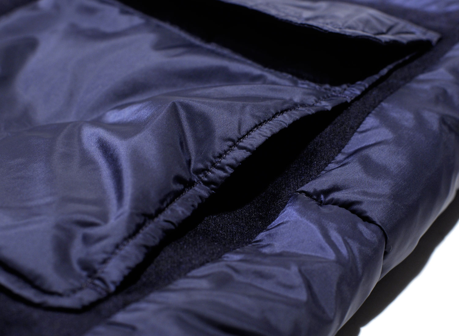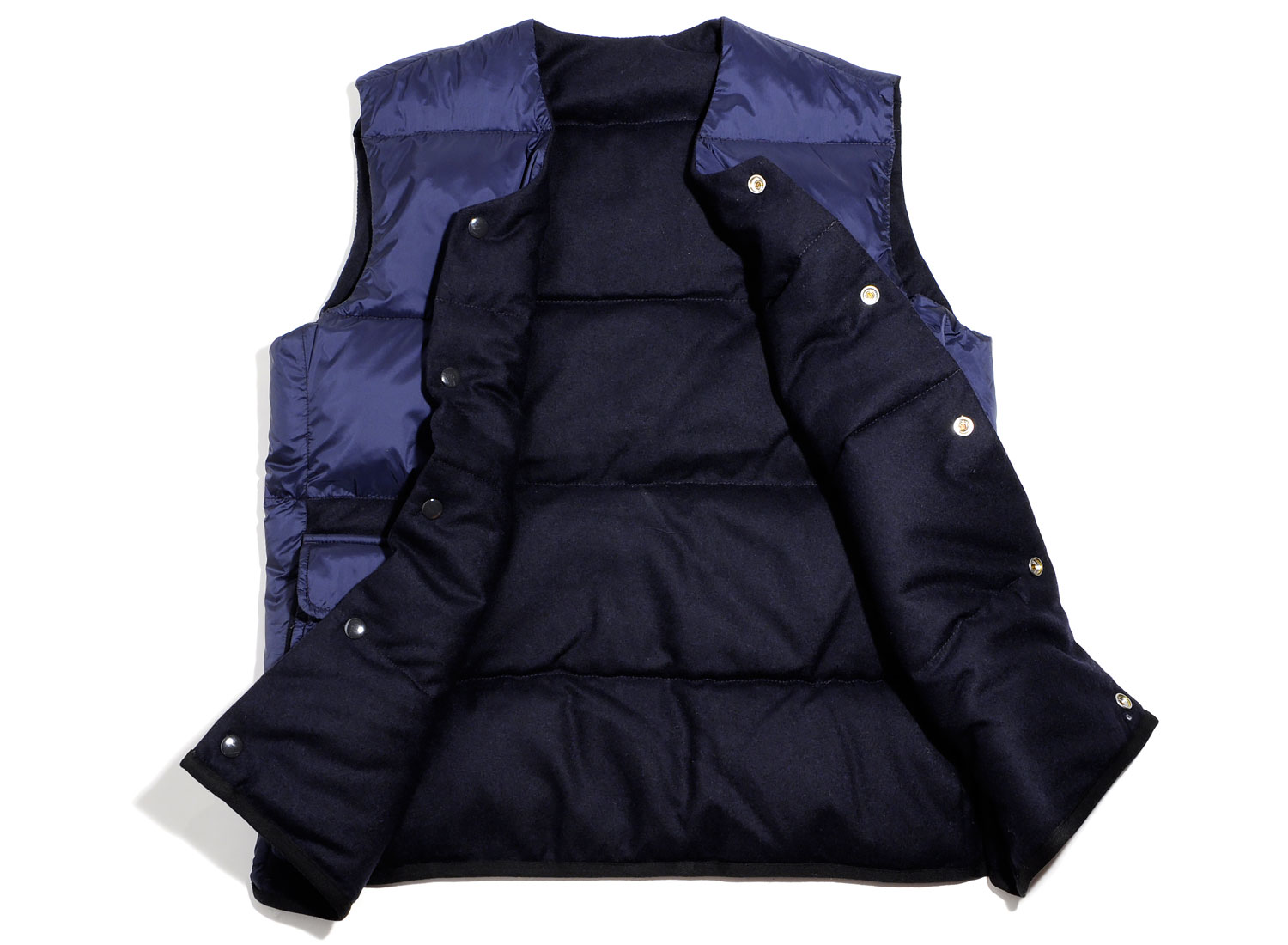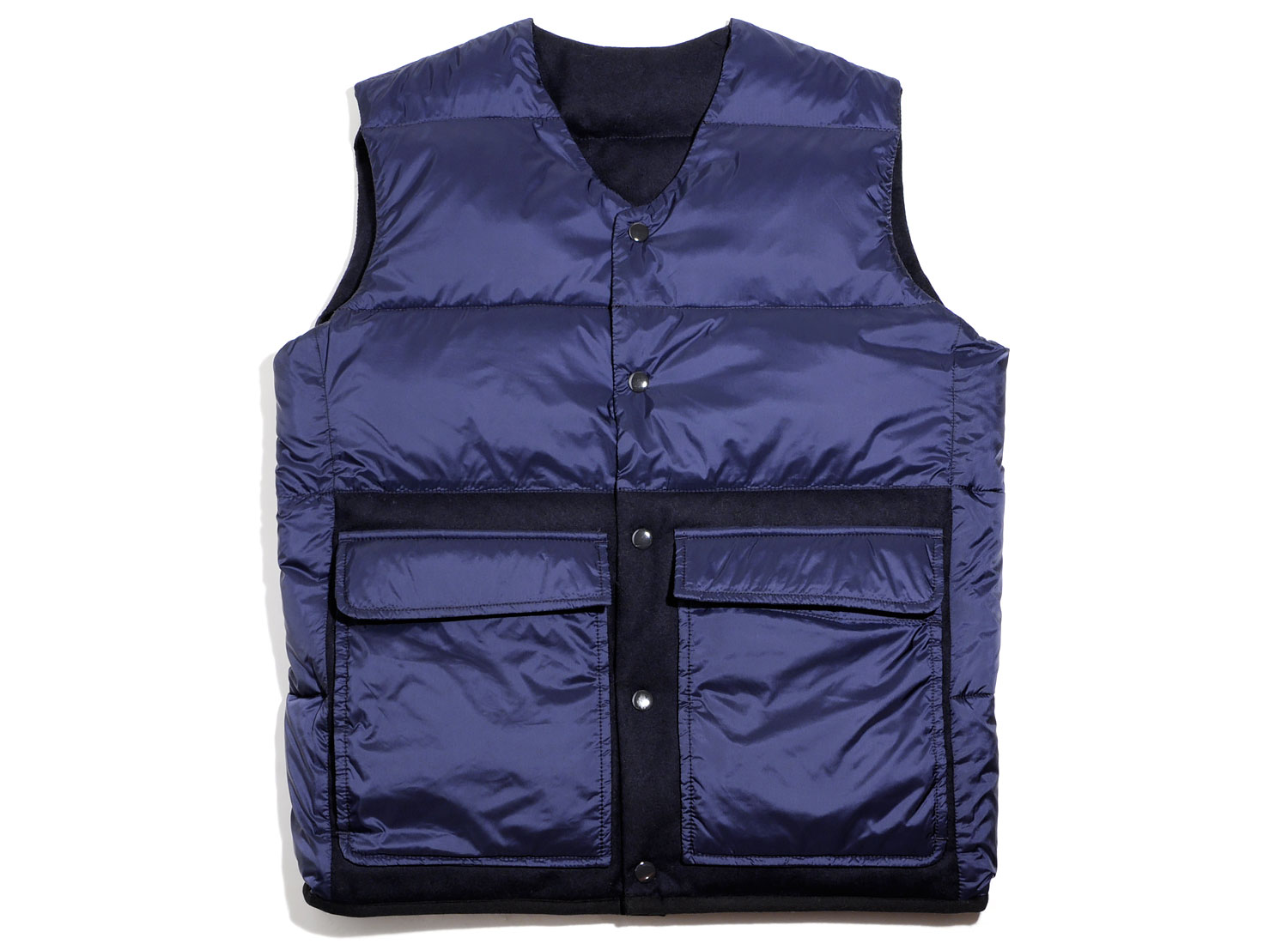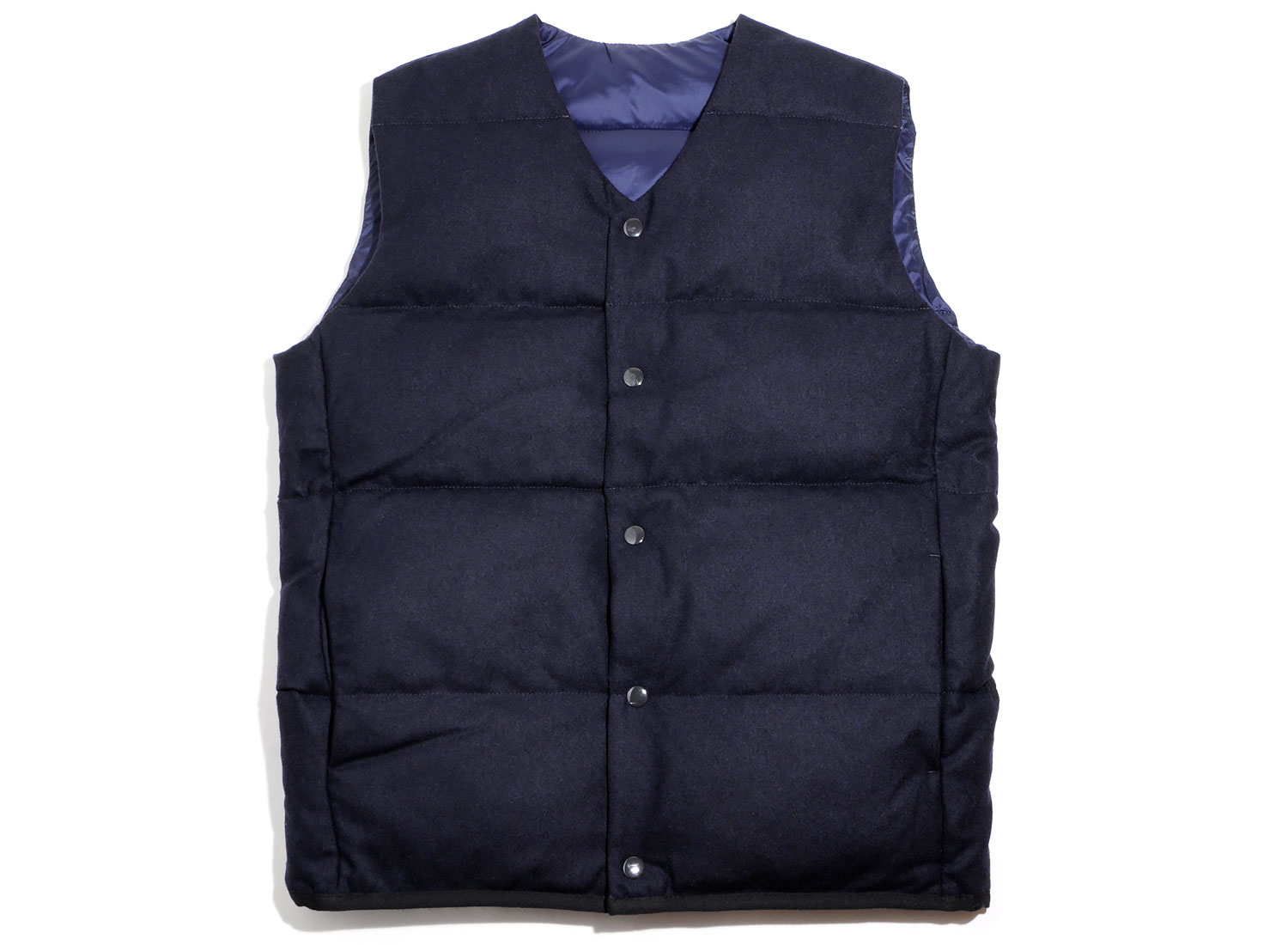BELLEROSE Lhost 72 Vest Navy. Très belle doudoune sans manche réversible. Une face en drap feutré 60% laine / 40% polyamide avec poches passepoilées. L'autre face 100% nylon avec poches à rabats. Encolure en V. Fermeture par boutons pressions. Rembourrage 100% duvet d'oie.