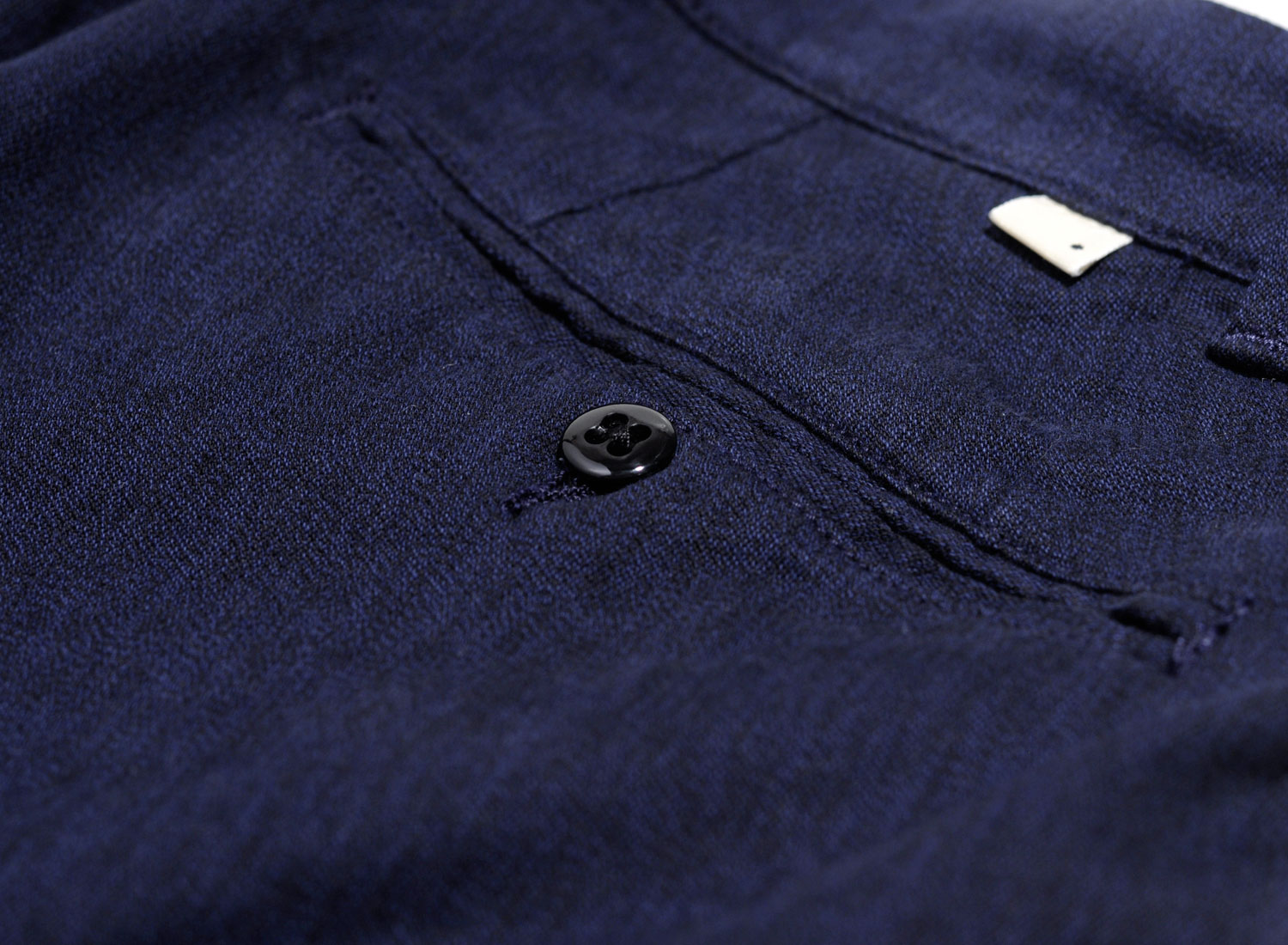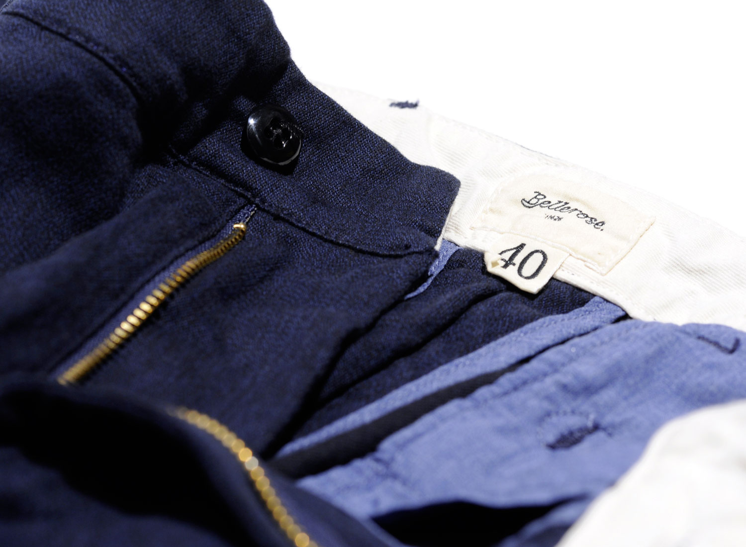 BELLEROSE Porth 72 Pants Worker. Pantalon chino slim fit confectionné en twill 98% coton / 2% Élasthanne. Deux poches passepoilées sur les côtés et deux autre à l'arrières. Braguette zippée. Doublure des poches en chambray bleu.