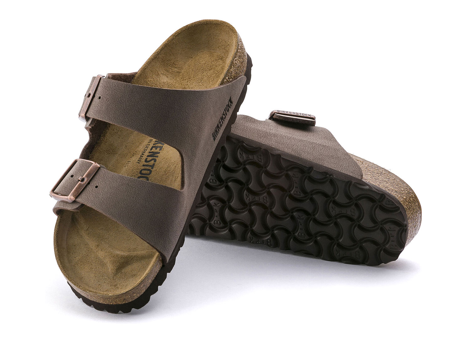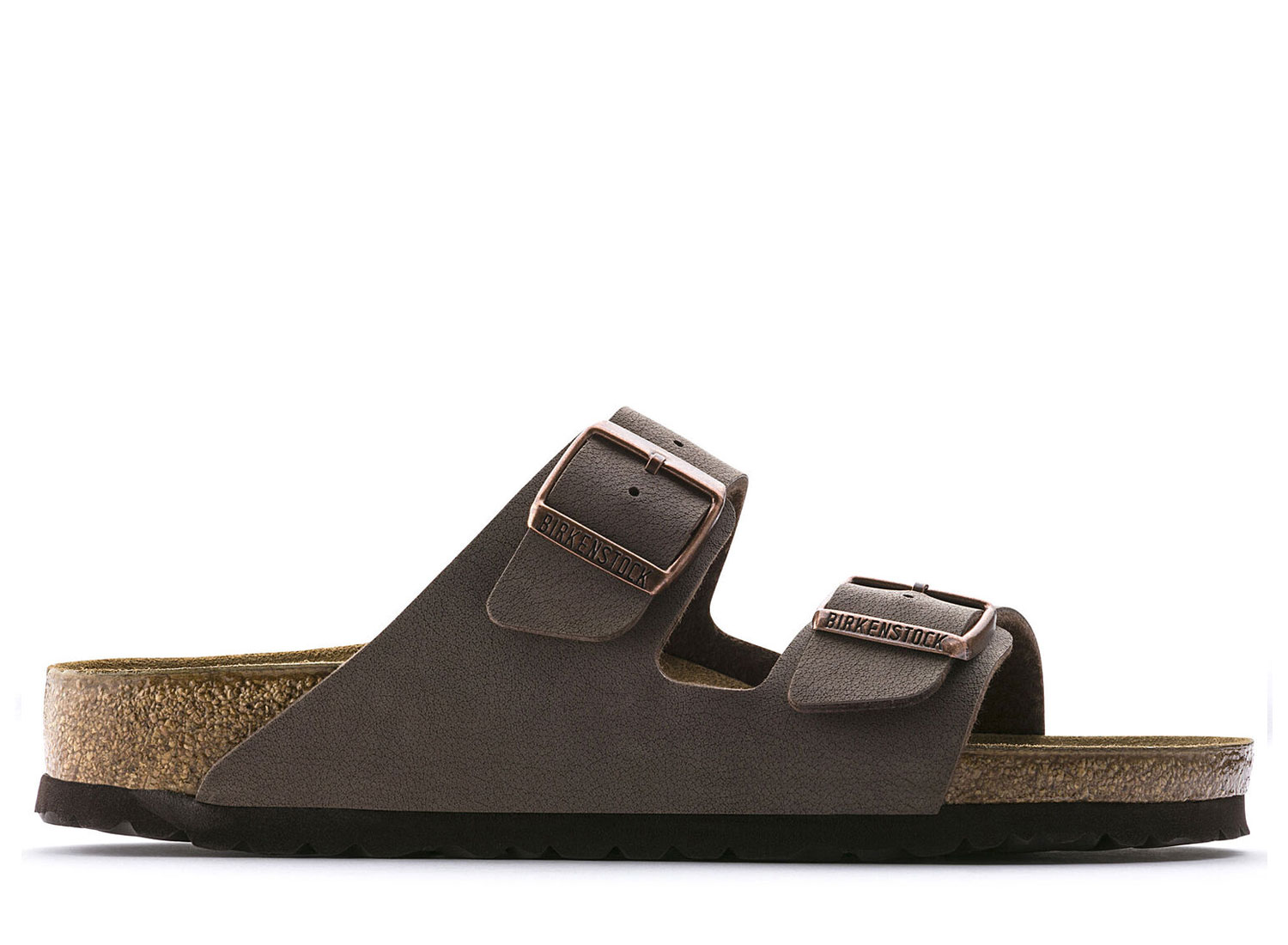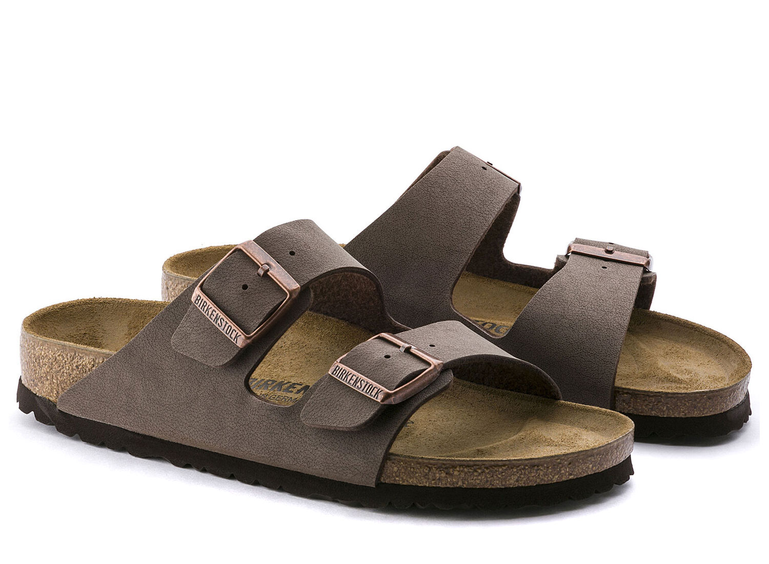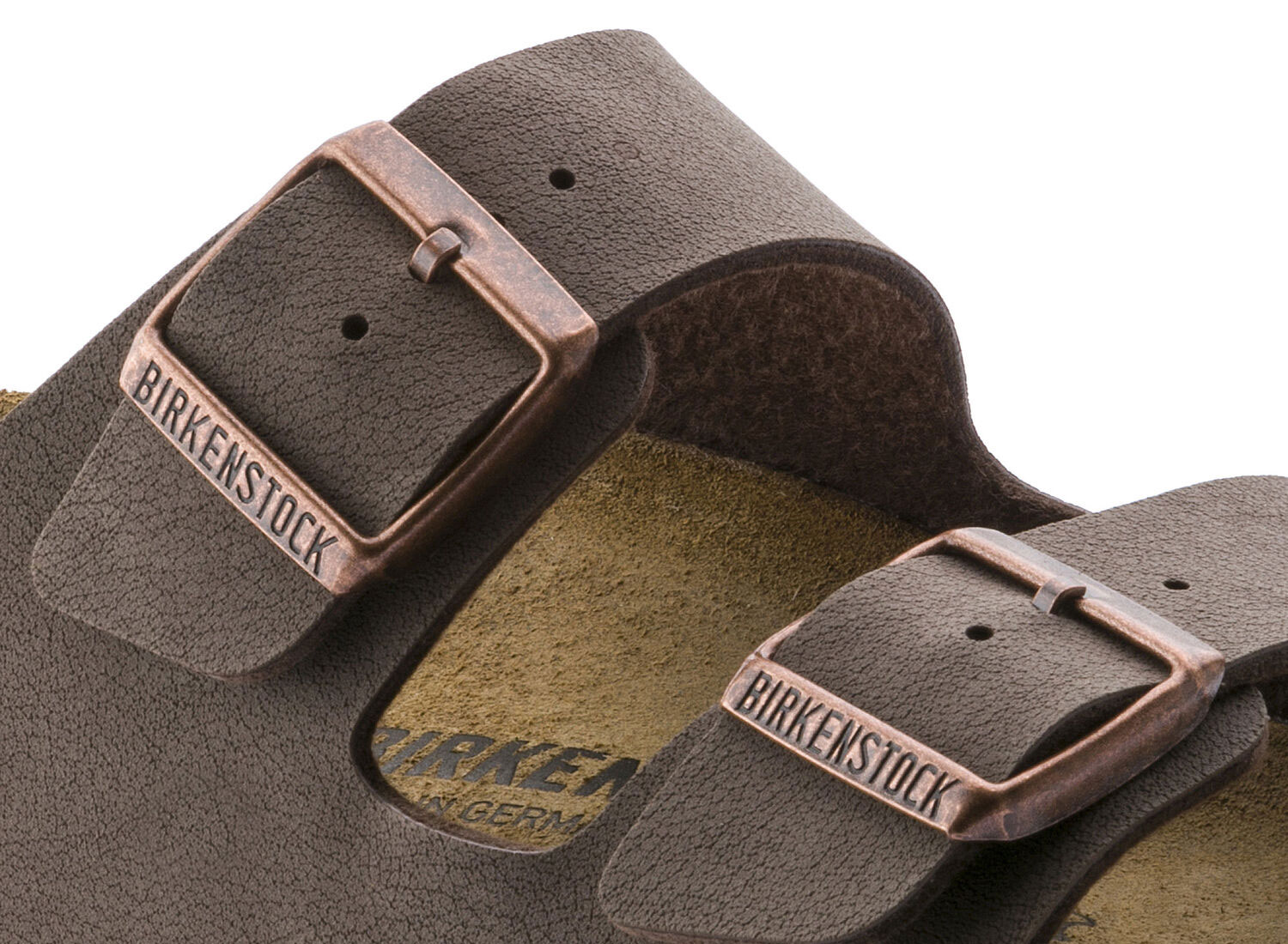 BIRKENSTOCK Arizona BFBC Mocha 0151181 / 0151183. Semelle anatomique en liège et EVA. Dessus : nubuck synthétique Détails : sangle avec deux boucles métalliques réglables individuellement Fabriqué en Allemagne