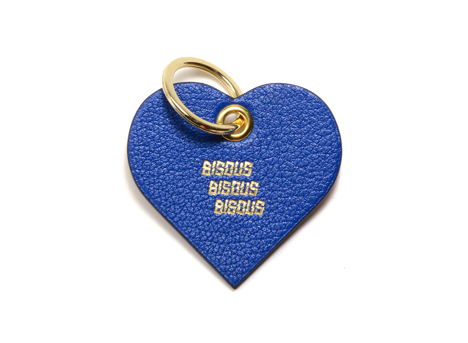 BISOUS SKATEBOARDS Coeur Leather Key Ring Royal Blue. Porte-clés taillé dans une pièce de cuir. Logo doré estampillé x3 bisous. Traitement maroquinier. Anneau brisé et œillet doré.
