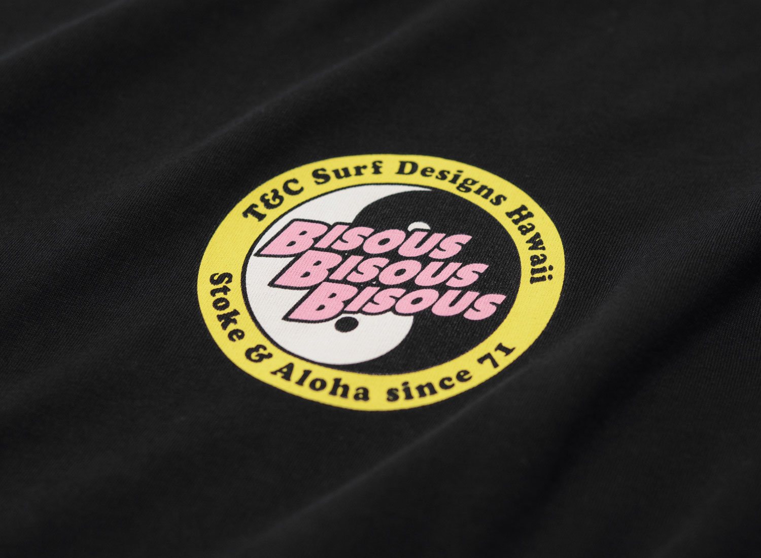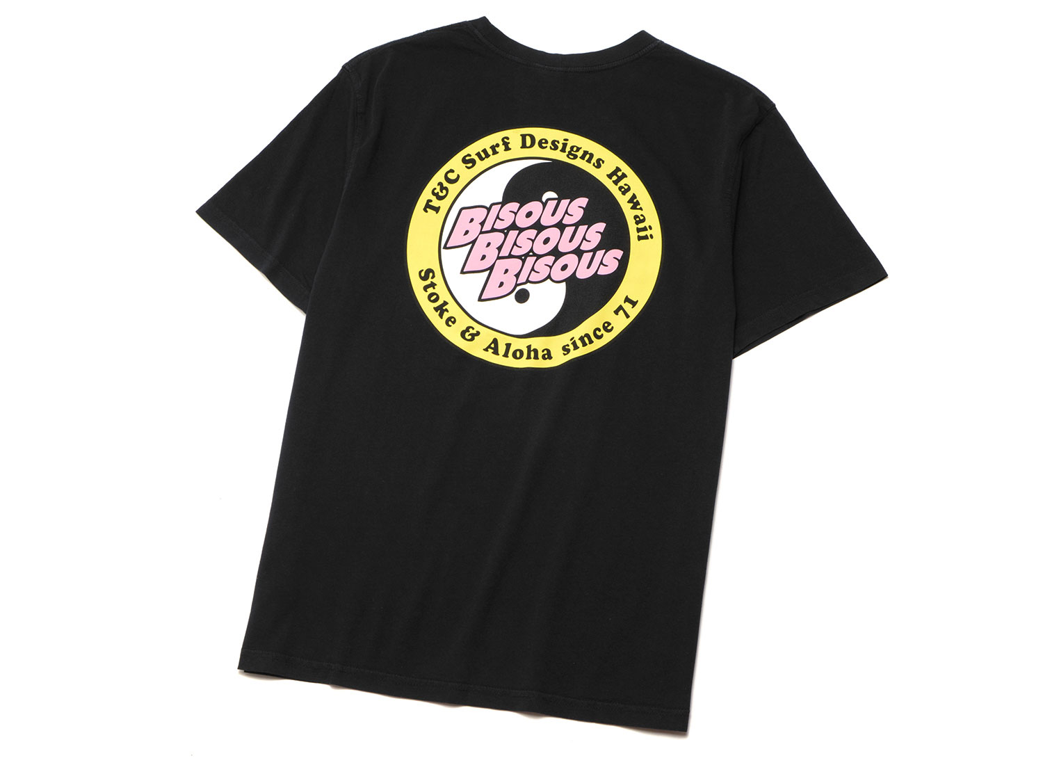 BISOUS SKATEBOARDS x T&C Tee Washed Black. Collaboration exclusive entre T&C Surf Designs et Bisous Skateboards. T-shirt manches courtes coupe regular confectionné en coton. Bords-côtes au col. Impression poitrine et au dos.