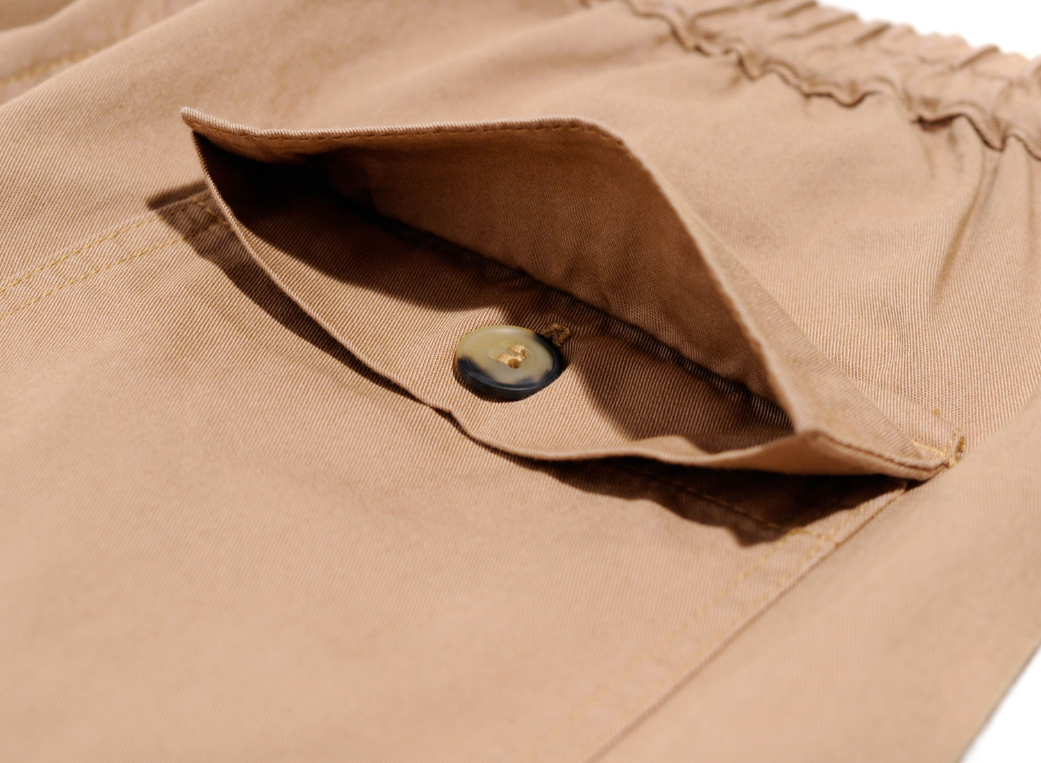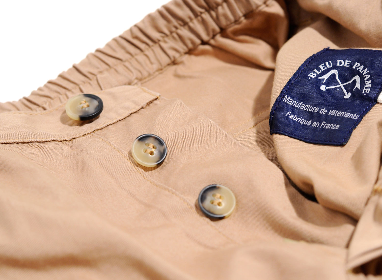 BLEU DE PANAME Pant KungFu Mastic. Joli pantalon estival confectionné en twill léger 100% coton. Coupe carotte resserrée sur le bas. Ceinture et bas élastiqué. Braguette boutonnée. Deux poches passepoilées sur les côtés. Deux poches à rabats boutonnés sur l'arrière. Fabriqué en France.