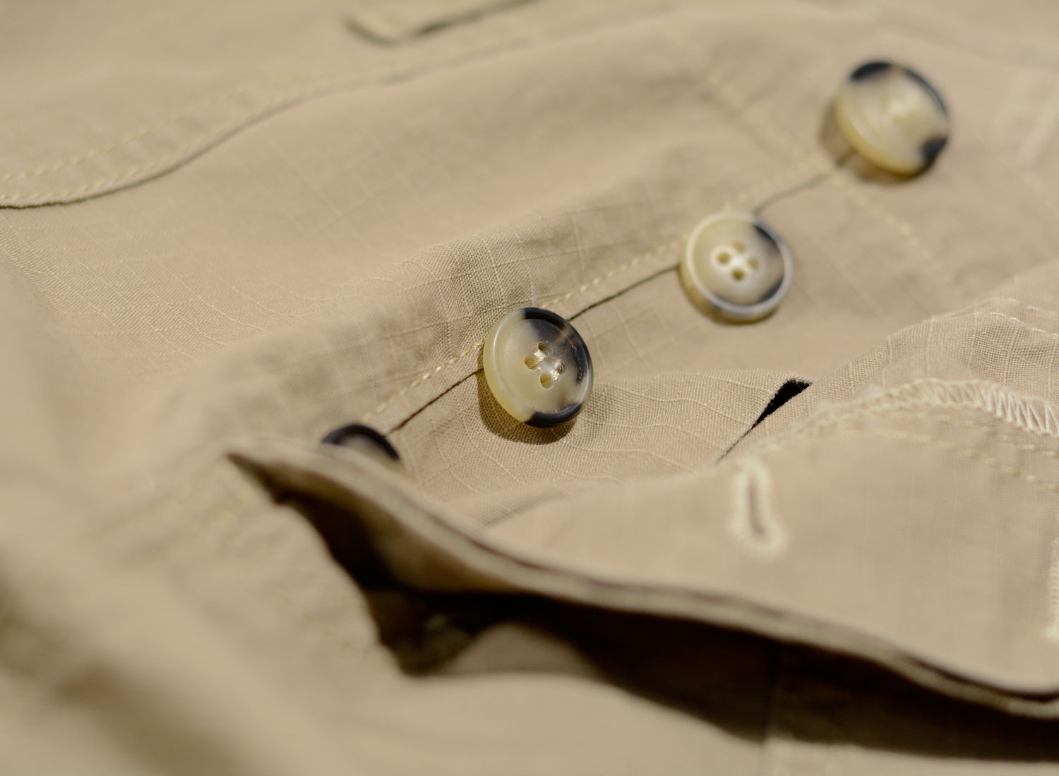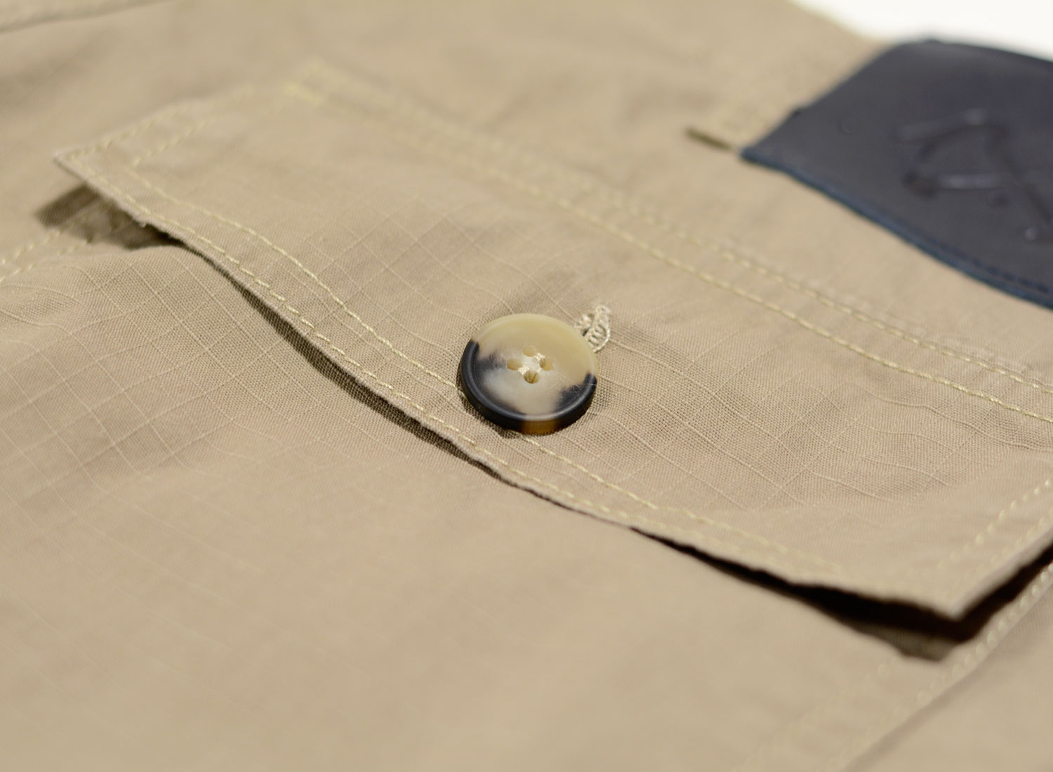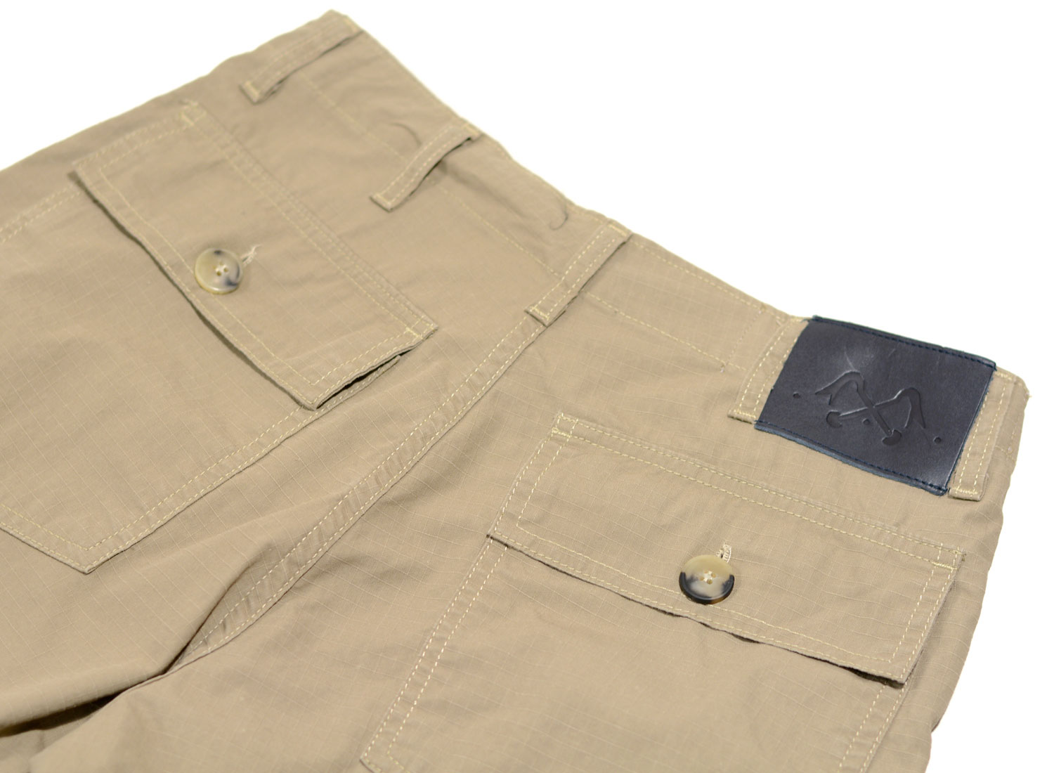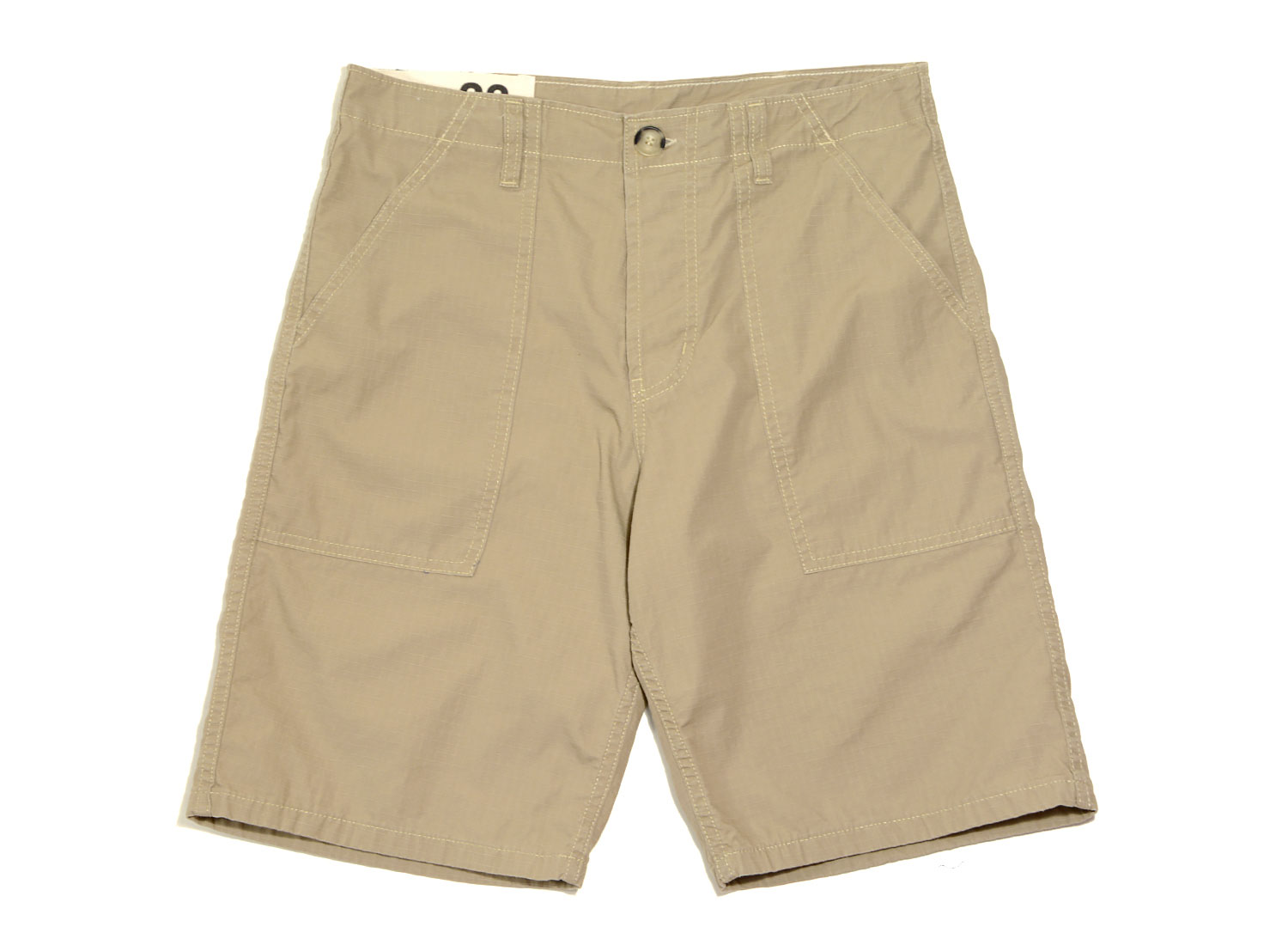 BLEU DE PANAME Short Fatigue Sable. Très beau short d'inspiration workwear confectionné en coton ripstop. Coupe regular. Poches HBT sur l'avant. Poches à rabats boutonnés sur l'arrière. Braguette boutonnée. Fabriqué en France.