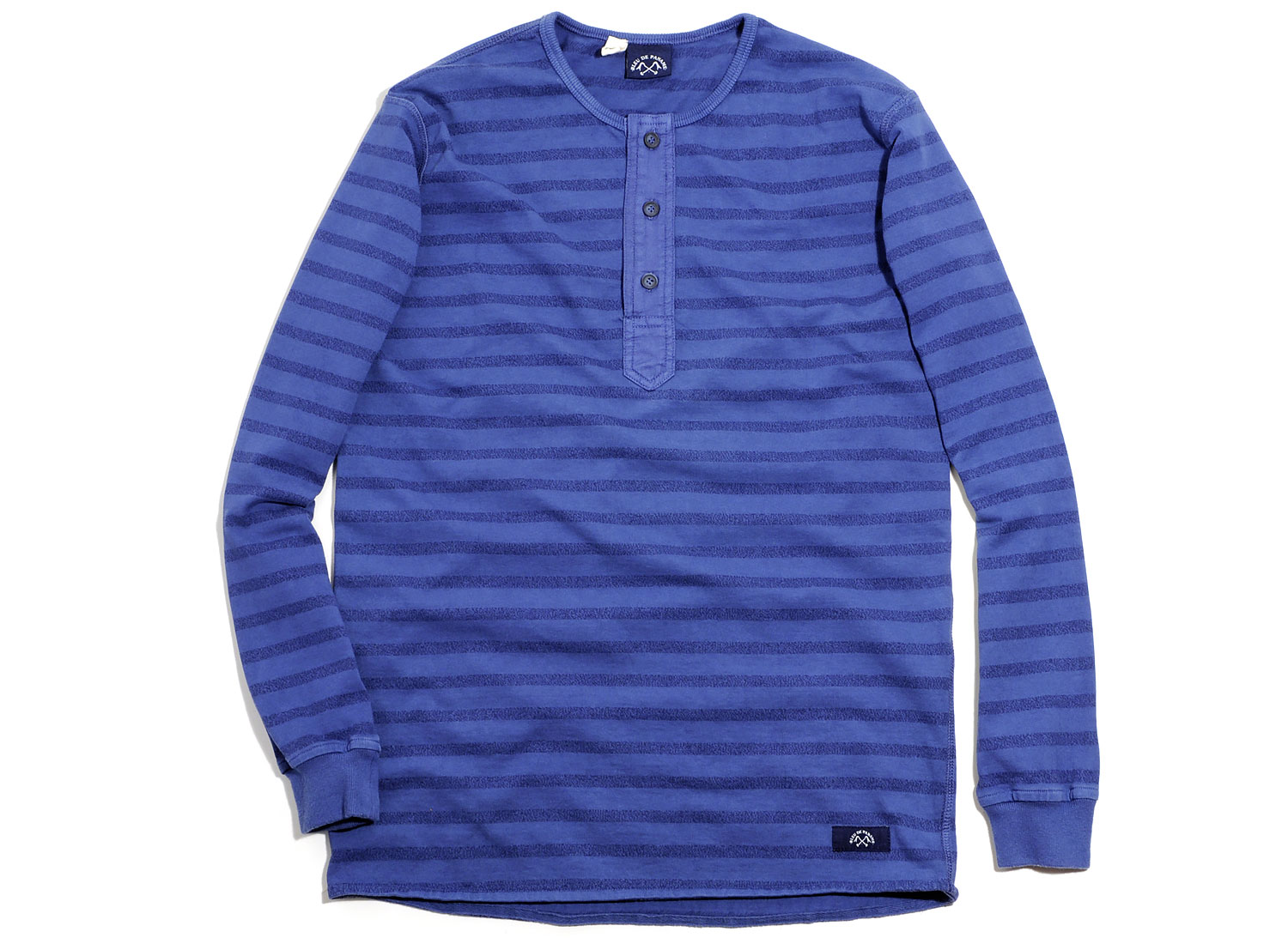 BLEU DE PANAME Tricot Baseball Indigo. Top manches longues rayé en molleton 100% coton. Col rond boutonné. Coupe droite. Bords-côtes aux poignets. Étiquette cousue sur le bas. Fabriqué en France.