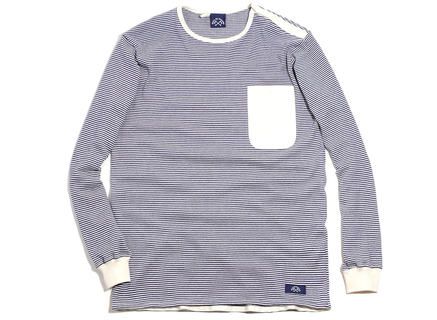 BLEU DE PANAME Tricot Marin Marine. Top manches longues rayé en tricot 100% coton. Coupe droite. Boutonnière sur l'épaule. Poche poitrine. Bords-côtes aux poignets. Découpe arrondie sur le bas. Fabriqué en France.