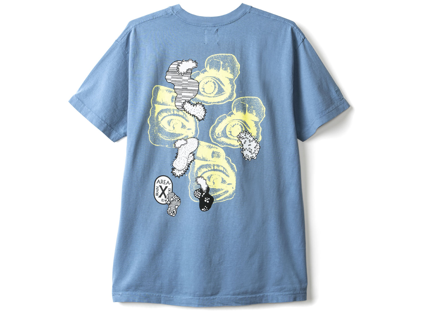 BRAIN DEAD Drop 8. Viral Tee Washed Blue. T-shirt manches courtes en jersey de coton lavé. Coupe droite. Impression sur la poitrine et au dos. Fabriqué aux USA.