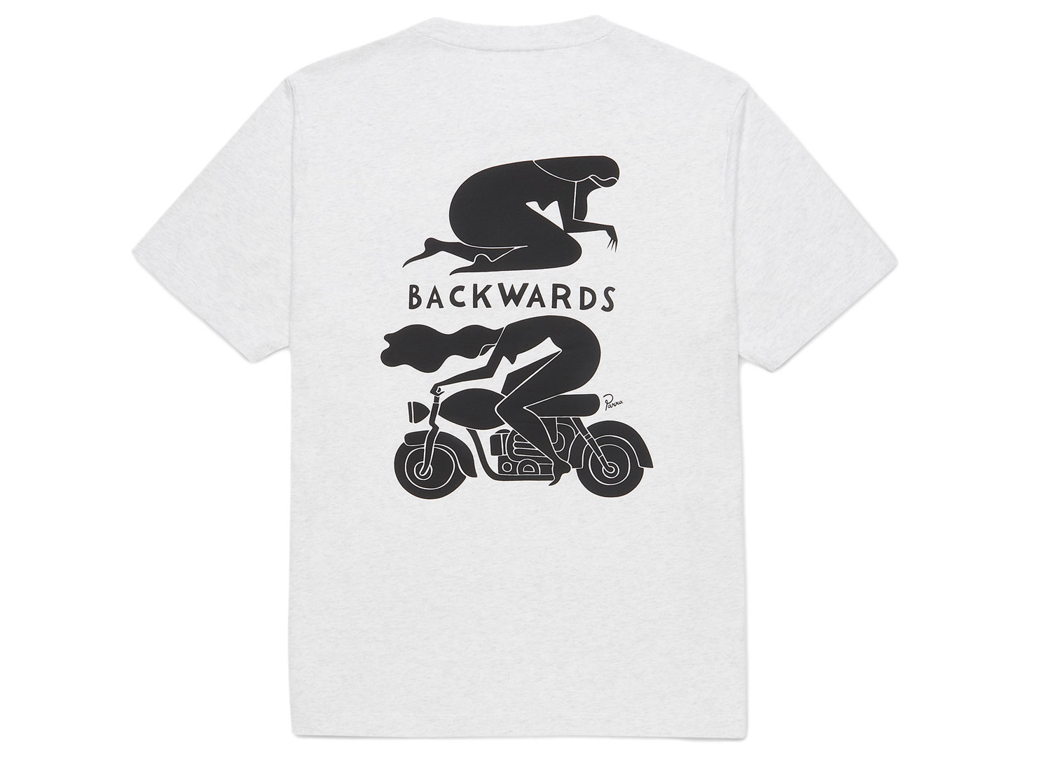 BY PARRA Backwards Tshirt Ash Grey. T-shirt coupe droite confectionné en coton jersey. Bord-côte au col. Impression sur la poitrine et dans le dos.