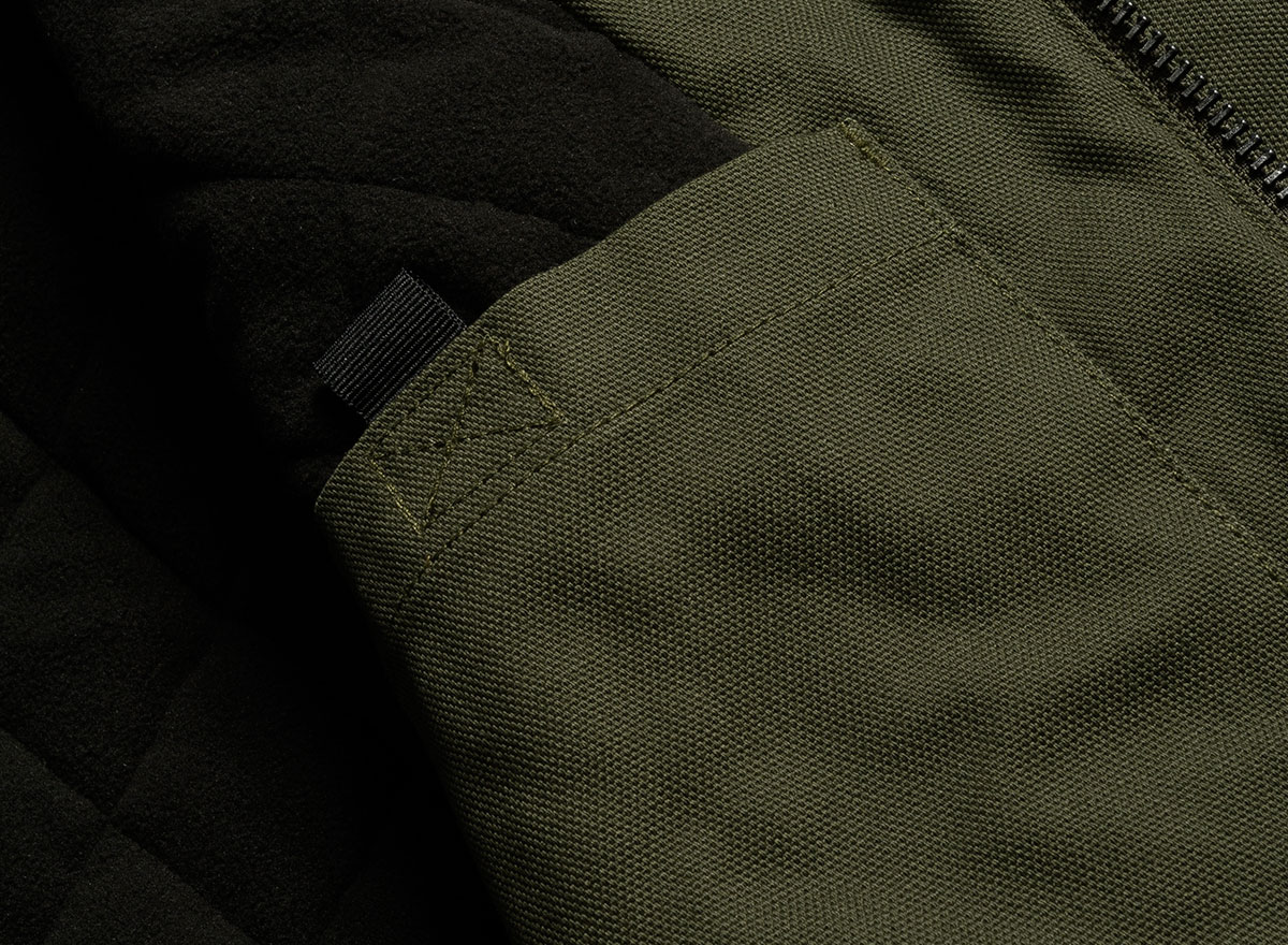 CARHARTT WIP Active Jacket Cypress. Très belle veste composée de coton canvas à 100%. Tissu hydrofuge. Doublure corps matelassée en micro-polaire. Doublure manches en taffetas de nylon. Doublure matelassée. Capuche ajustable. Poignets et bas côtelés. Poche kangourou. Etiquette carrée.