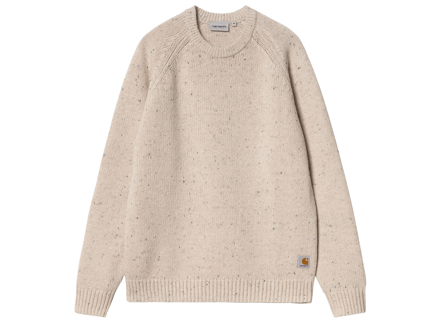 CARHARTT WIP Anglistic Sweater Speckled Moonbeam I010977. Pull col rond confectionné en maille chinée. 79% Laine, 18% Coton et 3% Acrylique. Coupe droite. Manches raglan. Bords-côtes au col, aux poignets et sur le bas. Label carré sur le bas.