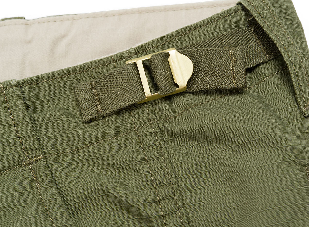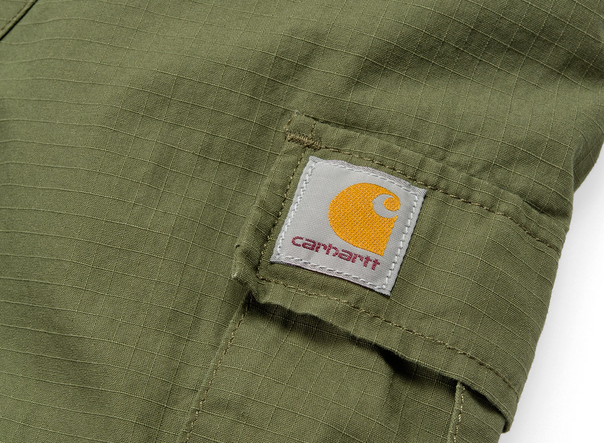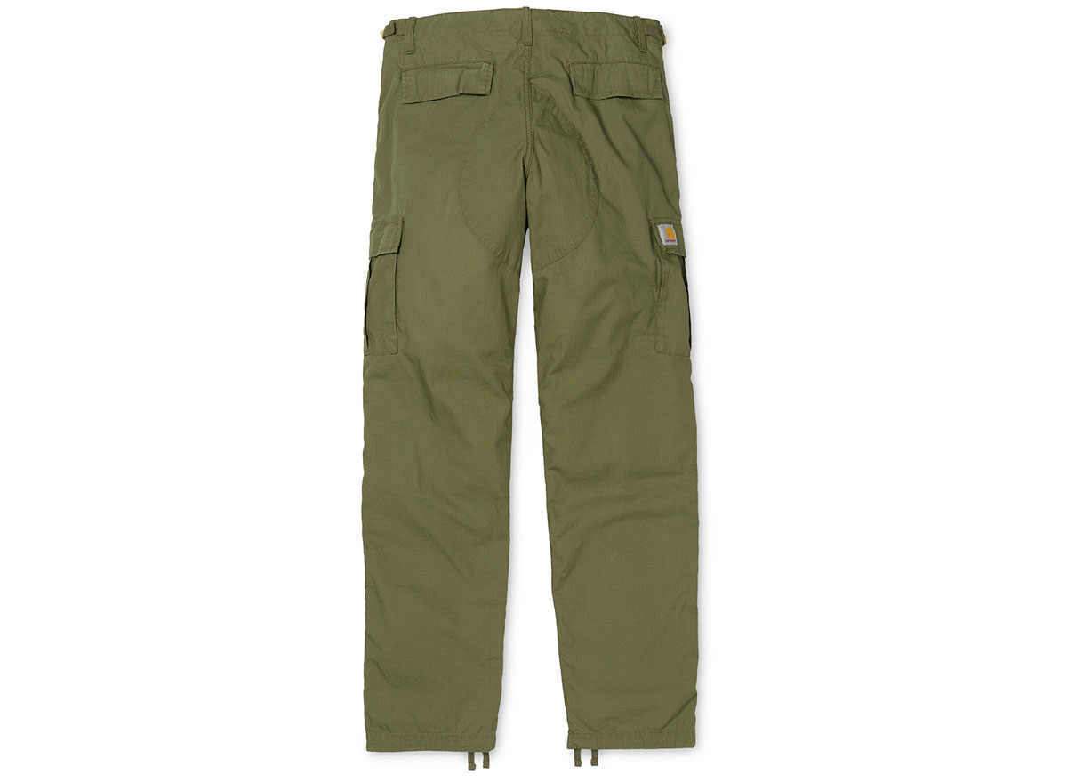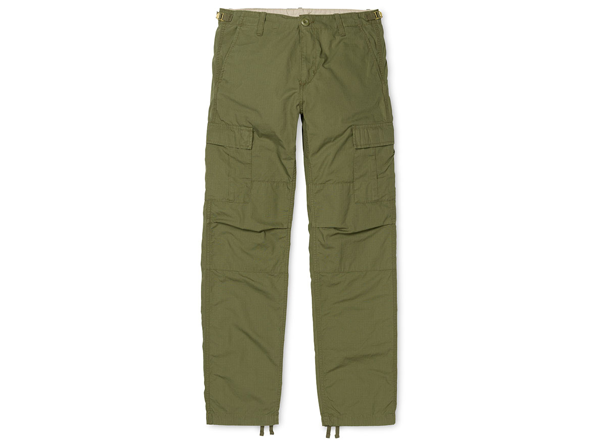 CARHARTT WIP Aviation Pant Rover Green. Cargo pants slim fit en Ripstop 100% coton. Taille basse. Braguette zippée. Pattes de serrage à la taille. Genoux renforcés. "Square label".