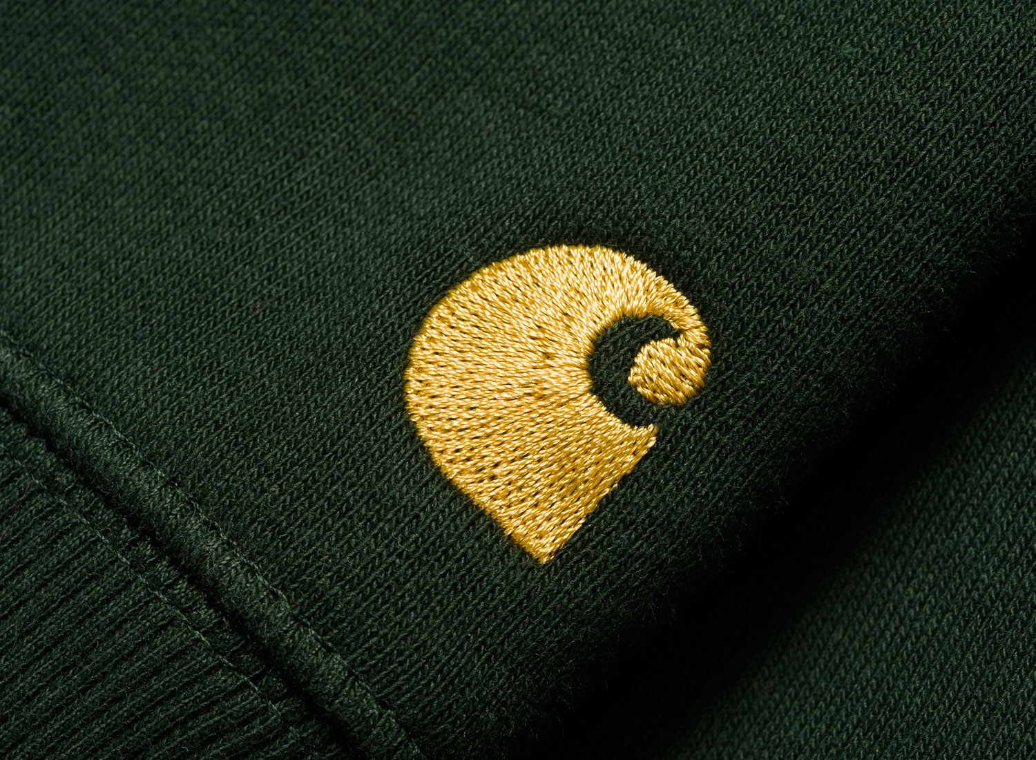 CARHARTT WIP Chase Sweatshirt Loden / Gold I026383. Sweatshirt col rond confectionné en molleton épais et confortable. 58% coton / 42% Polyester. Coupe droite. Bords-côtes aux col, aux poignets et sur le bas. Broderie sur la manche.