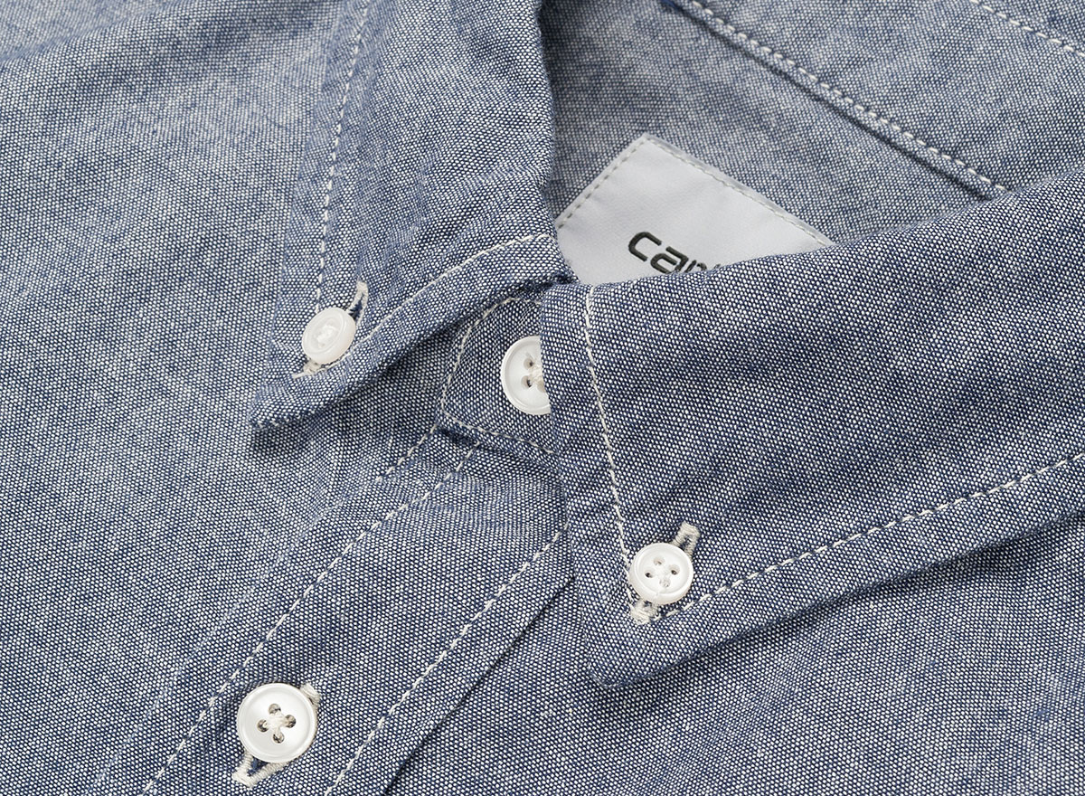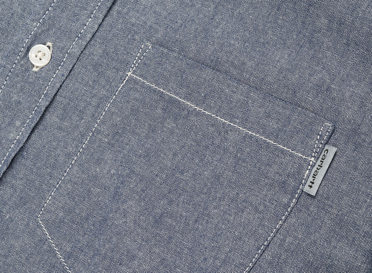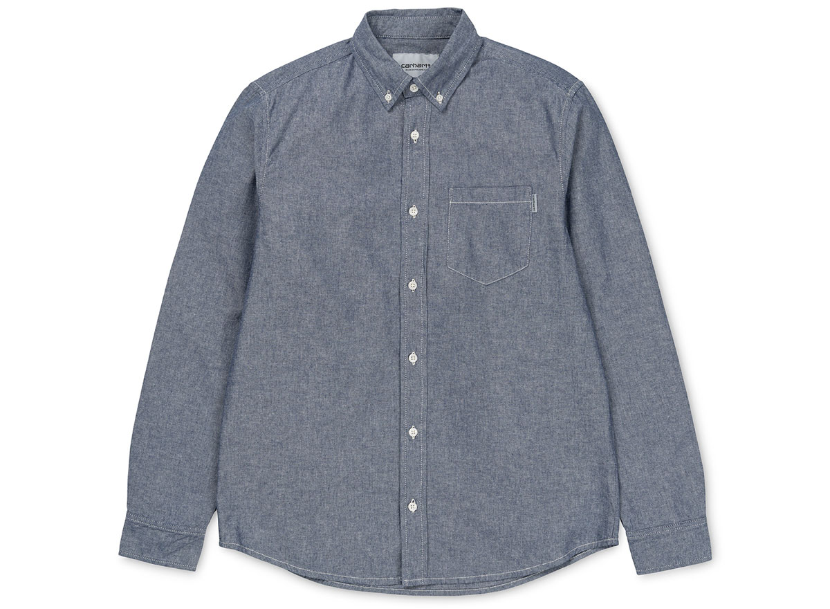 CARHARTT WIP Carhartt Civil Shirt Blue Rinsed. Chemise à coupe regular en chambray 100% coton 4,5oz. Col et poignets boutonnés. Poche poitrine. Découpe arrondie sur le bas.