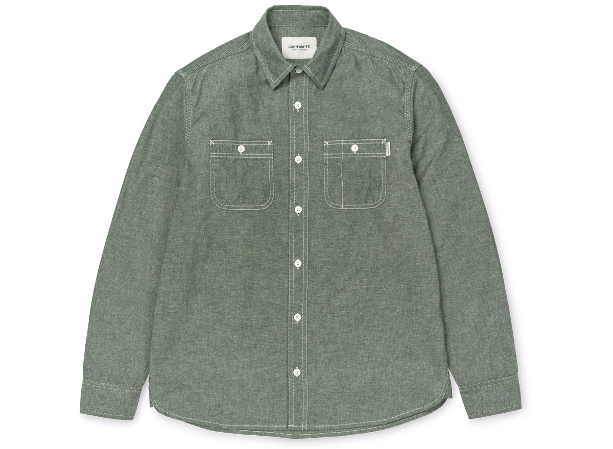 CARHARTT WIP Clink Shirt Hedge I023979. Chemise manches longues en Chambray 100% coton. Coupe regular. Coutures contrastées. Deux poches sur l'avant. Poignets boutonnés. Découpe arrondies sur le bas.