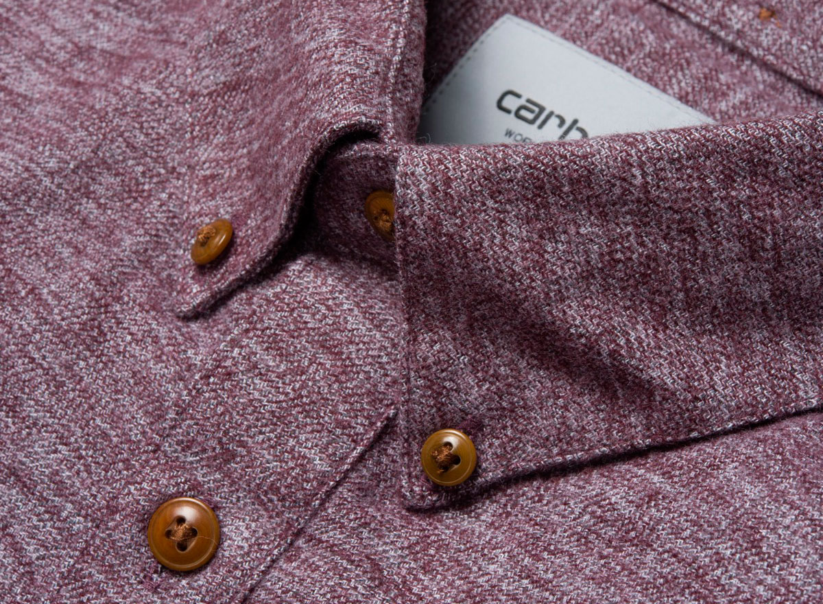 CARHARTT WIP Cram Shirt Mulberry. Chemise coupe droite confectionnée twill de coton chiné. Coupe droite. Une poche poitrine. Col et poignets boutonnés. Boutons en corozo. Découpe arrondie sur le bas.