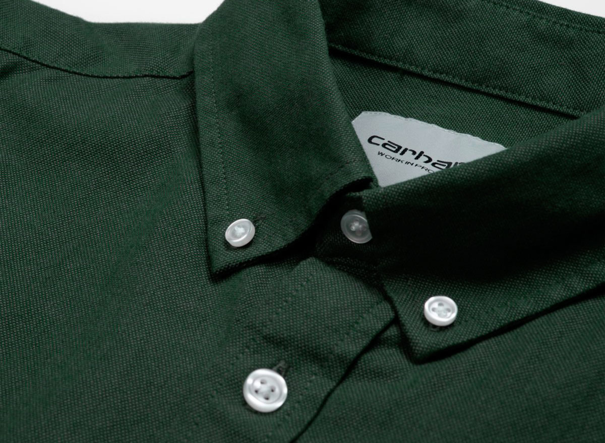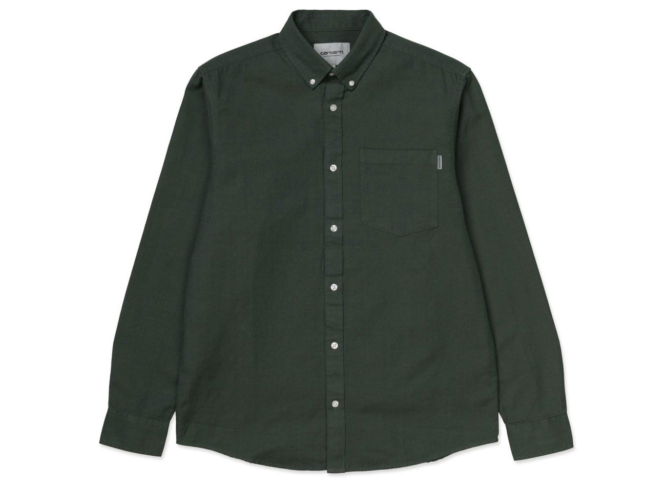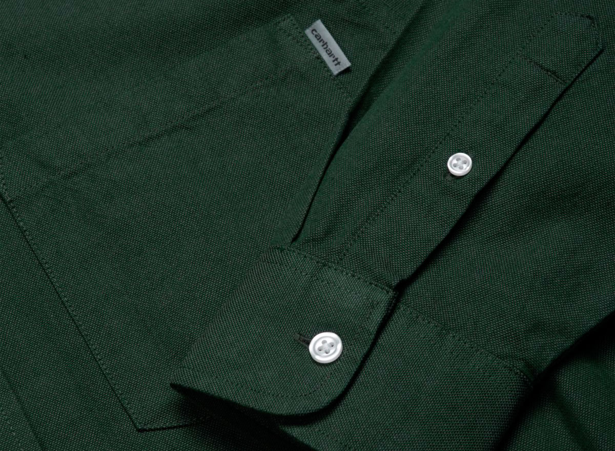 CARHARTT WIP Datlon Shirt Dark Fir / Leaf I016889. Chemise coupe droite confectionnée en flanelle de coton oxford. Coupe droite. Une poche poitrine. Col et poignets boutonnés. Découpe arrondie sur le bas.