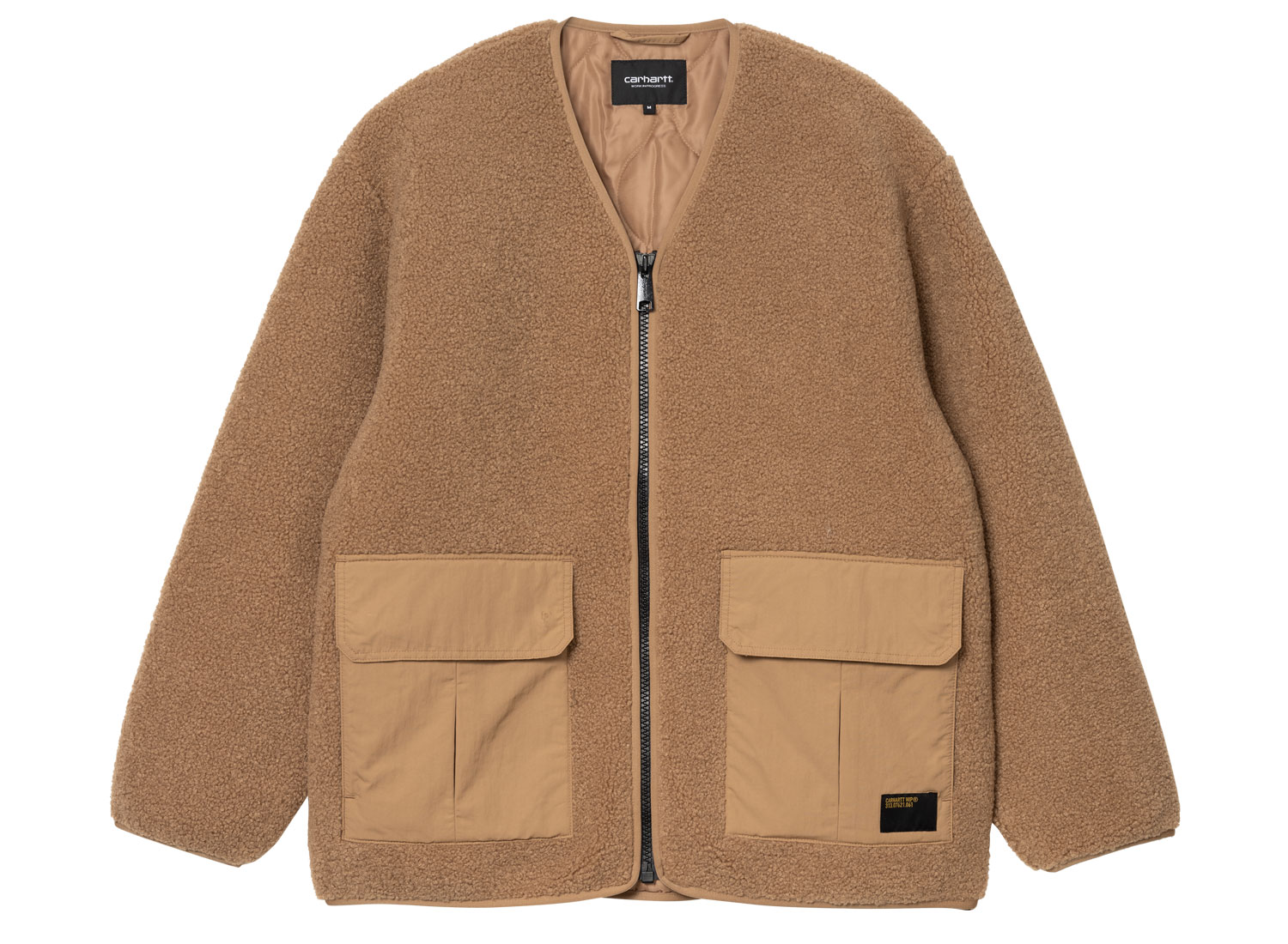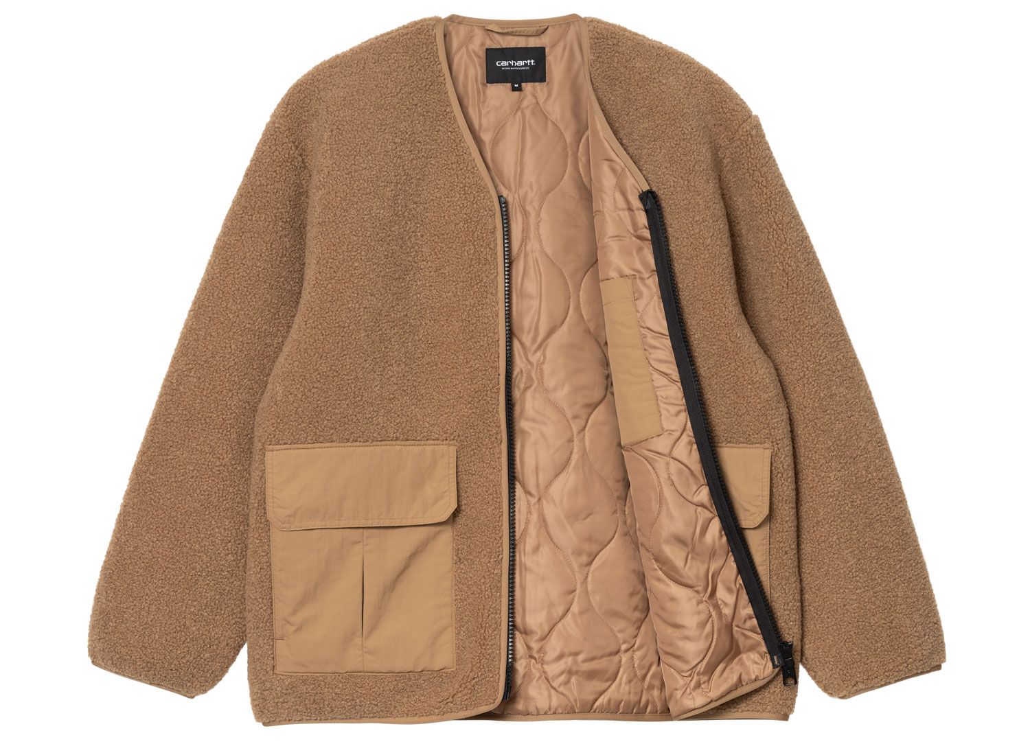 CARHARTT WIP Devin Liner Peanut I032244. Liner confectionné sherpa de polyester épais. Doublure matelassé 100 % polyester motif "oignons". Fermeture zippée. Military Label sur le bas. Détails en taffetas de nylon sur les poches.