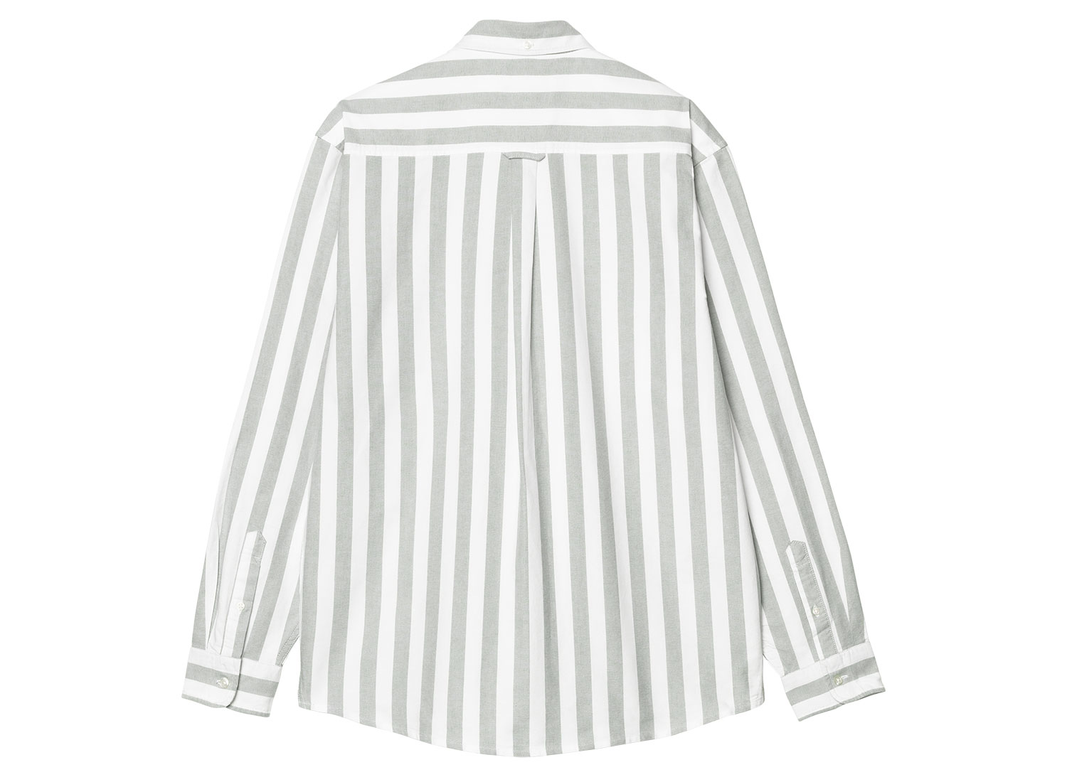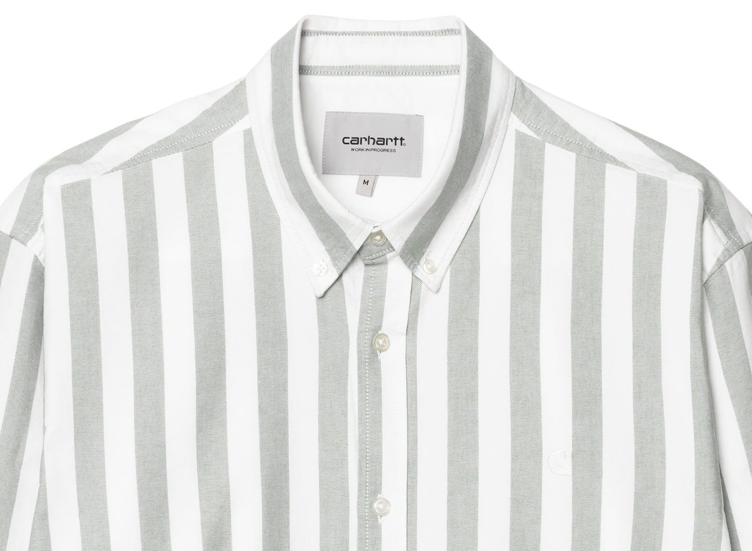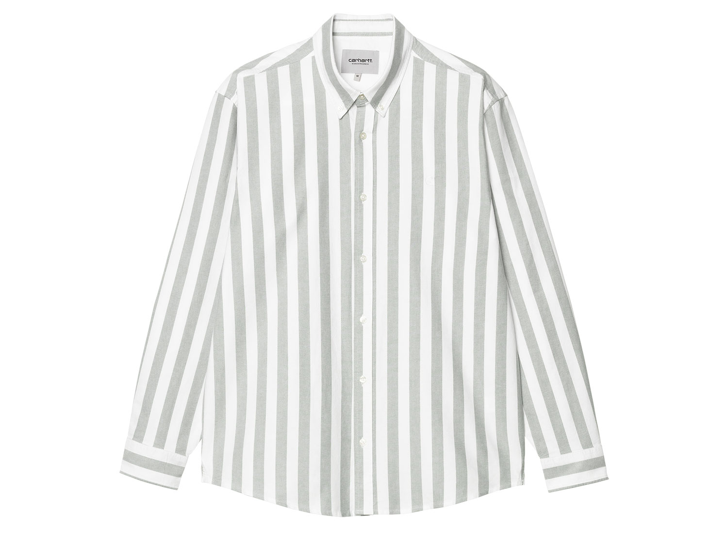 CARHARTT WIP Dillion Shirt Stripe Park / White I033027. Chemise à rayures confectionnée en coton Oxford léger. 100 % coton. Tissu pré-lavé. Logo "Carhartt" brodé sur la poitrine. Empiècement au dos. Col et poignets boutonnés.