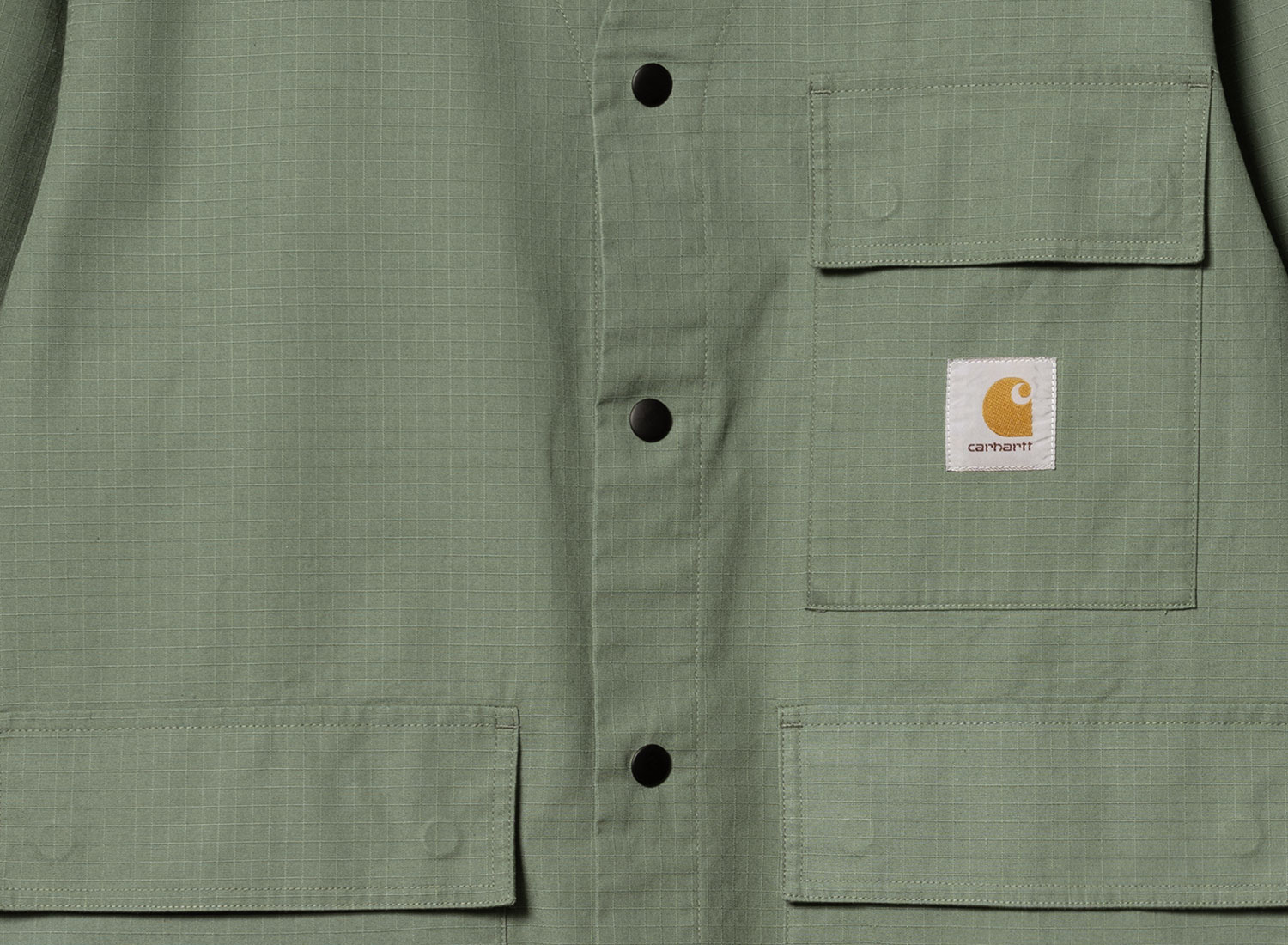 CARHARTT WIP Elroy Shirt Jac Park I033020. Veste-chemise confectionnée en ripstop de coton semi-épais. Ripstop Columbia : 100 % coton. Encolure sans col. Non doublée. Poche poitrine avec fermeture à boutons-pression. Deux poches inférieures avec fermeture à boutons-pression. Square Label.