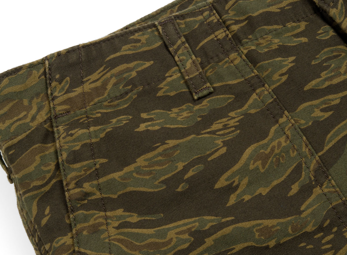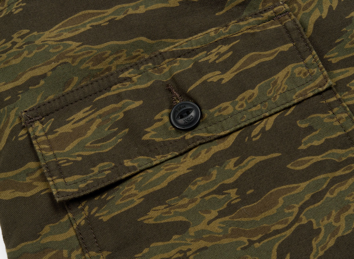 CARHARTT WIP Fatigue Short Camo Tiger. Short fatigue sateen twill 100% coton. Coupe regular. Braguette zippée. Deux grandes poches sur l'avant. Deux poches à rabats boutonnés au dos. Étiquette militaire.