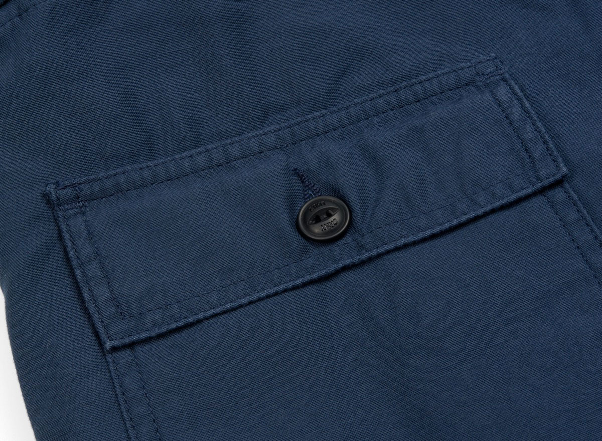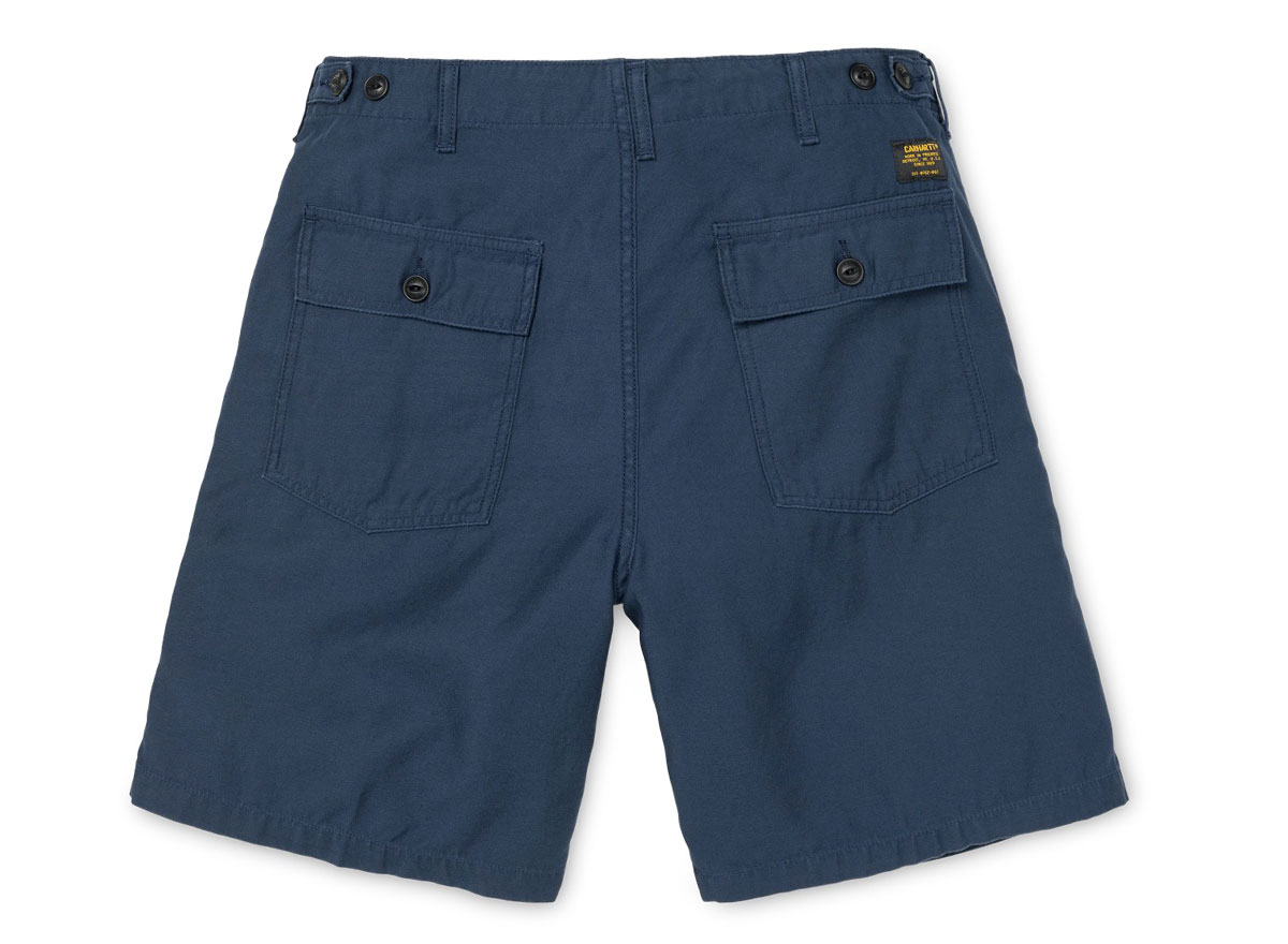 CARHARTT WIP Fatigue Short Navy. Short fatigue sateen twill 100% coton. Coupe regular. Braguette zippée. Deux grandes poches sur l'avant. Deux poches à rabats boutonnés au dos. Étiquette militaire.
