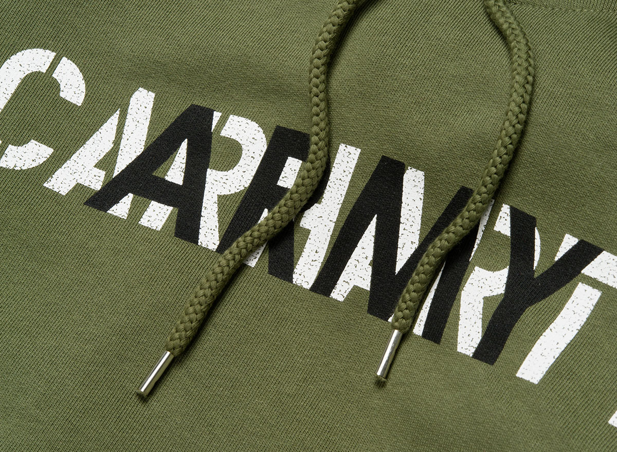 CARHARTT WIP Hooded CA Training Sweatshirt Rover Green. Sweat capuche en molleton non gratté 100% coton 9,1oz. Coupe droite. Bords-côtes aux poignets et sur le bas. Impression sur l'avant. Poche kangourou.