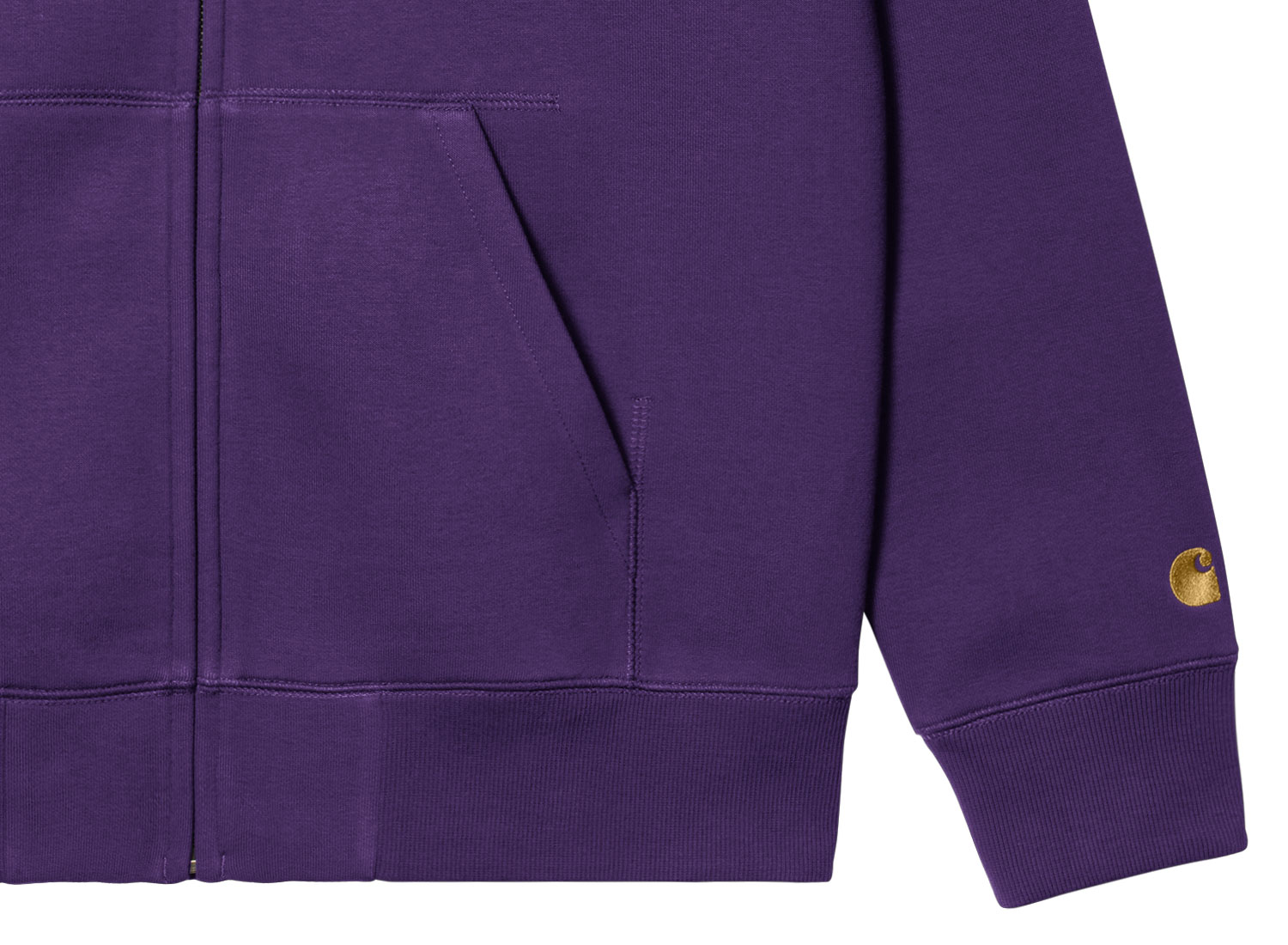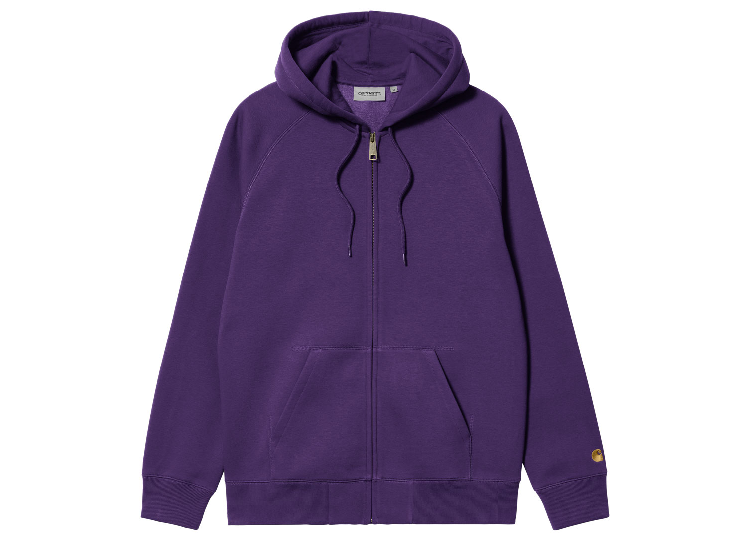 CARHARTT WIP Hooded Chase Jacket Tyrian / Gold I033664. Hoodie zippé 58% coton et 42% polyester. Manches raglan. Coupe droite. Bords-côtes aux poignets et sur le bas. Broderie Carhartt sur la manche. Capuche ajustable. Poche kangourou.