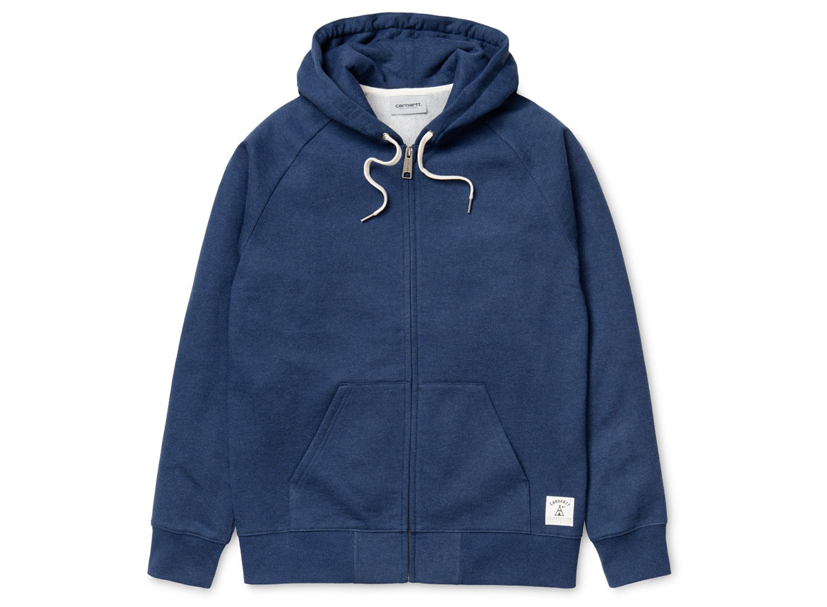 CARHARTT WIP Hooded Holbrook Jacket Blue. Veste zippée à capuche confectionnée en molleton chiné. 60% coton / 40% polyester. Coupe droite. Manches raglan. Cordon de serrage sur la capuche. Bords-côtes aux poignets et sur le bas. Poche kangourou. Holbrook label sur le bas.