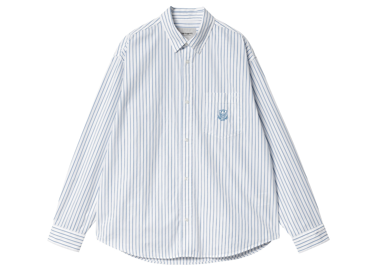 CARHARTT WIP Linus Stripe Shirt Bleach / White I033029. Chemise à rayures confectionnée en popeline de coton légère. Tissu pré-lavé. 100 % coton. Coupe loose. Broderie sur la poitrine.
