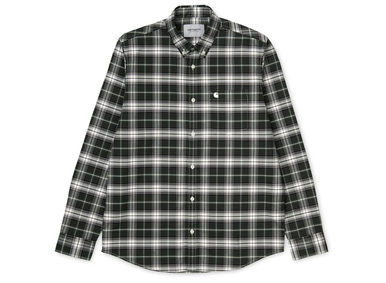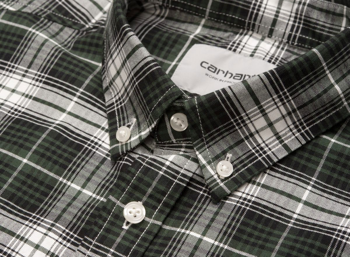 CARHARTT WIP Linville Shirt Check Chrome Green I026801. Oxford 100 % coton, 4,7 onces. Coupe droite. Teinté dans le fil. Délavé. Col boutonné. Poche sur la poitrine. Logo brodé. Étiquette avec lettrage WIP.