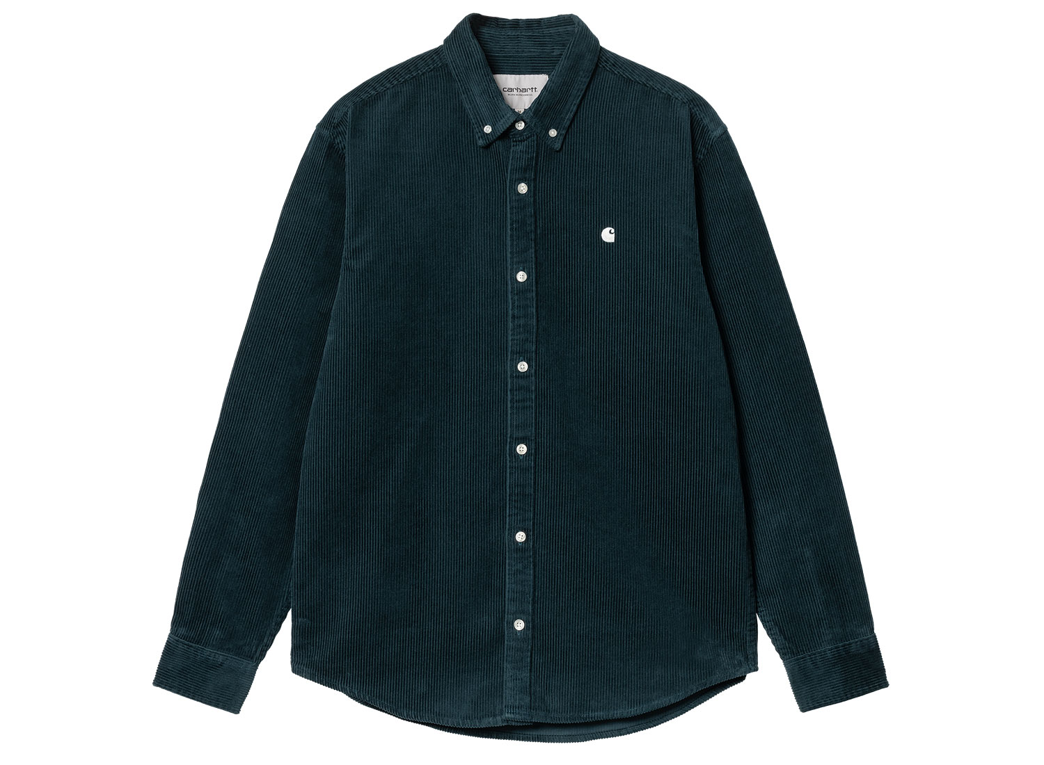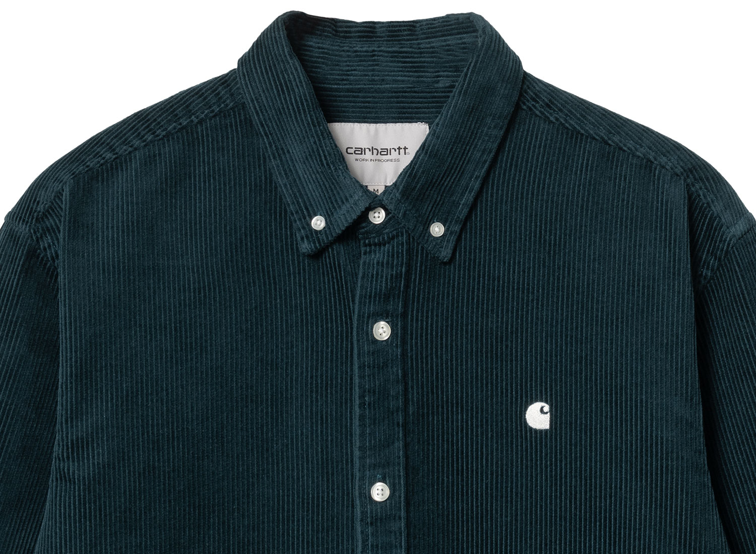 CARHARTT WIP Madison Cord Shirt Duck Blue / Wax I029958. Chemise coupe droite confectionnée en velours côtelé 100% coton. Broderie sur la poitrine. Col et poignets boutonnés. Découpe arrondie sur le bas. Étiquette WIP sur la patte.