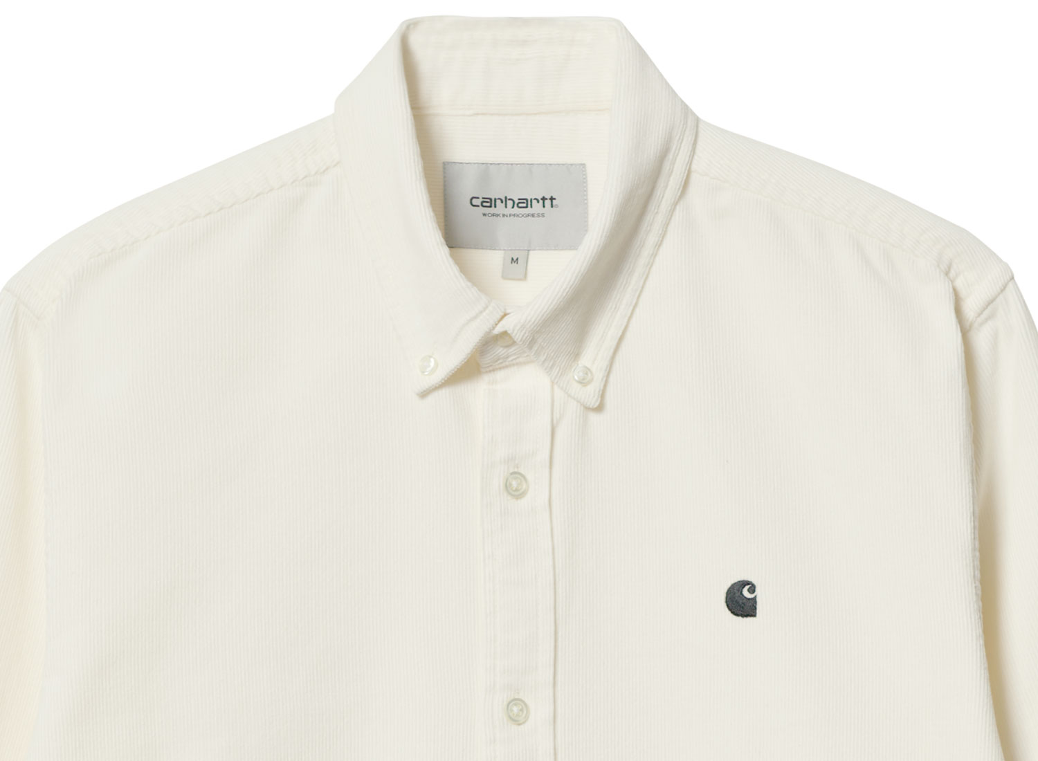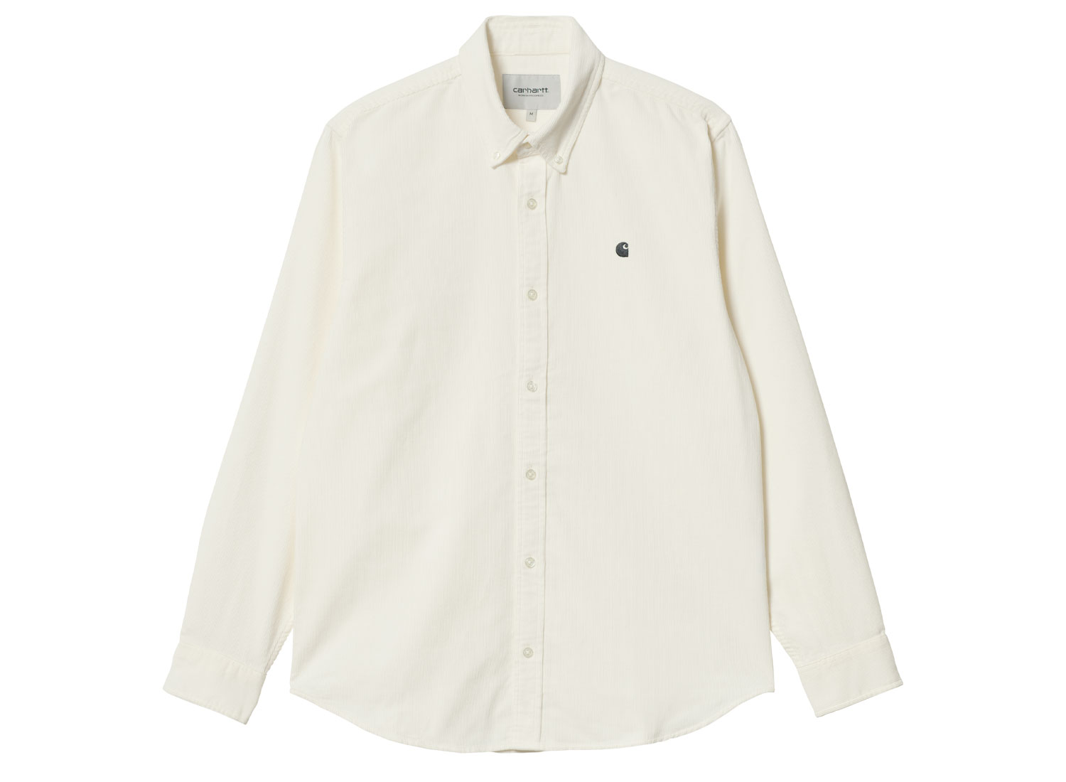 CARHARTT WIP Madison Fine Cord Shirt Wax / Black I030580. Chemise coupe droite confectionnée en velours côtelé 100% coton. Broderie sur la poitrine. Col et poignets boutonnés. Découpe arrondie sur le bas. Étiquette WIP sur la patte.