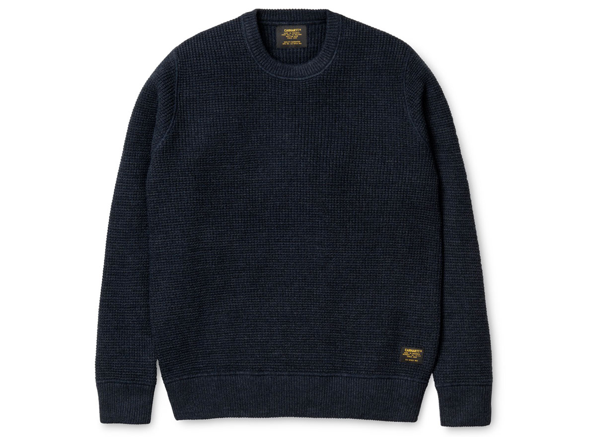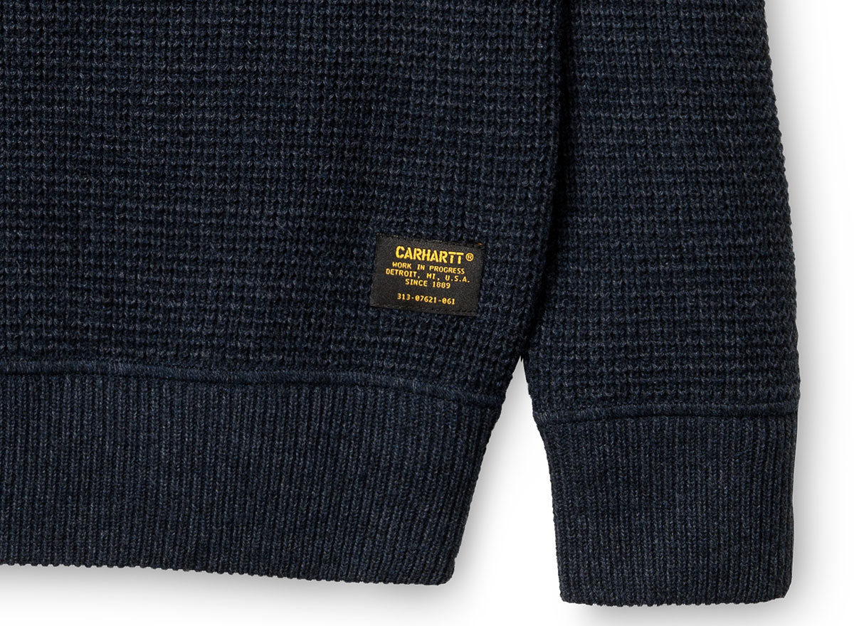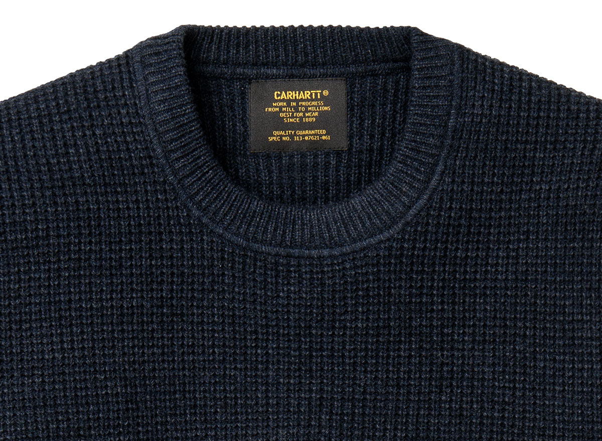 CARHARTT WIP Mason Sweater Dark Navy. Pull col rond confectionné en maille gaufrée. 55% coton / 35% laine / 10% Nylon. Coupe droite. Bords-côtes au col, aux poignets et sur le bas. Military label sur le bas.