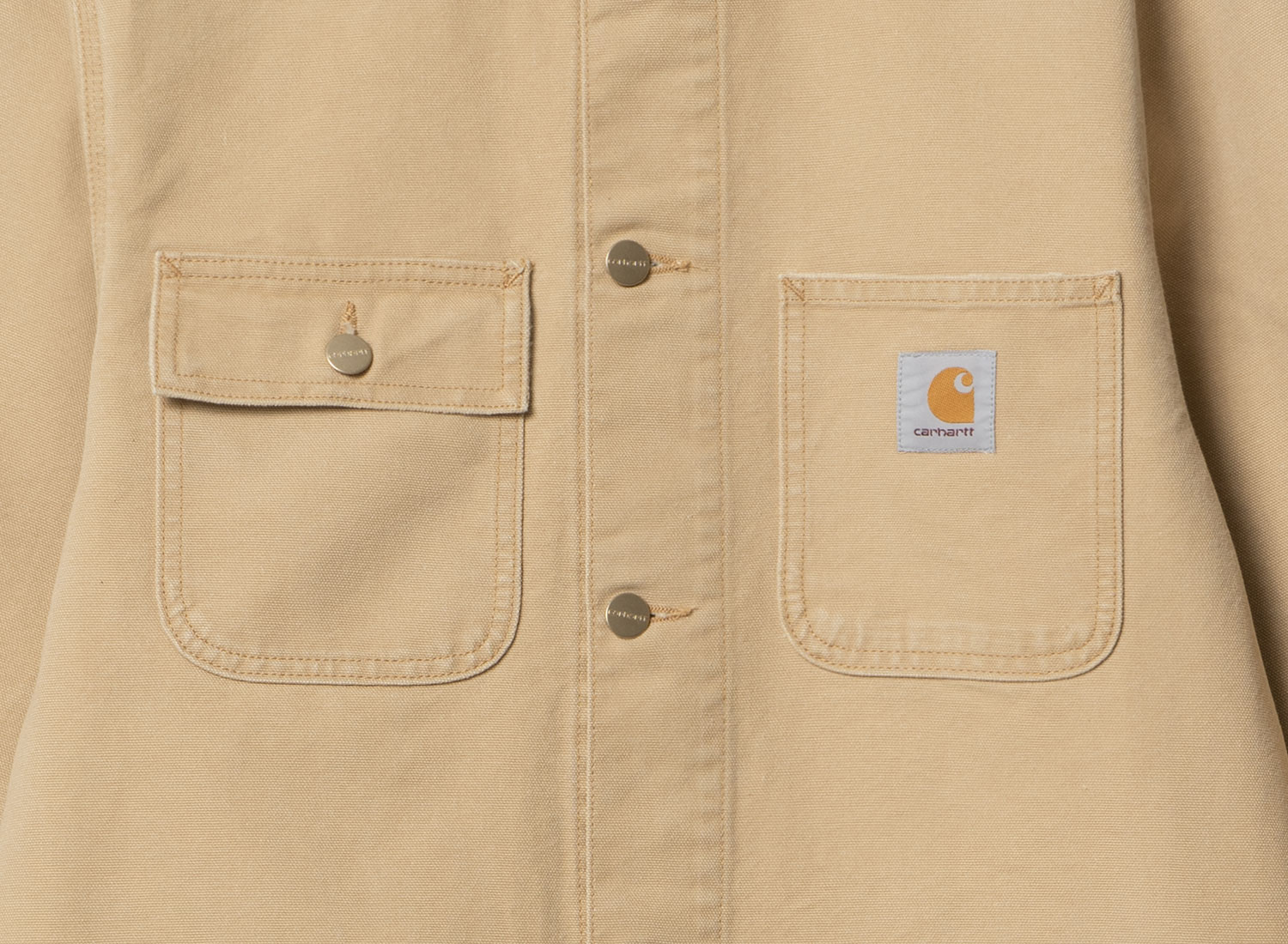 CARHARTT WIP Michigan Coat Summer Bourbon Aged Canvas I031519. Veste workwear confectionnée en canevas 100% coton Dearborn. Non doublée. Col en velour côtelé. Coupe droite. Fermeture boutonnée. Quatre poches sur l'avant. Poignets ajustables. "Square logo" sur la poche poitrine.