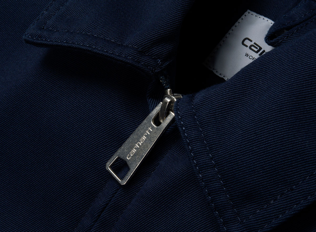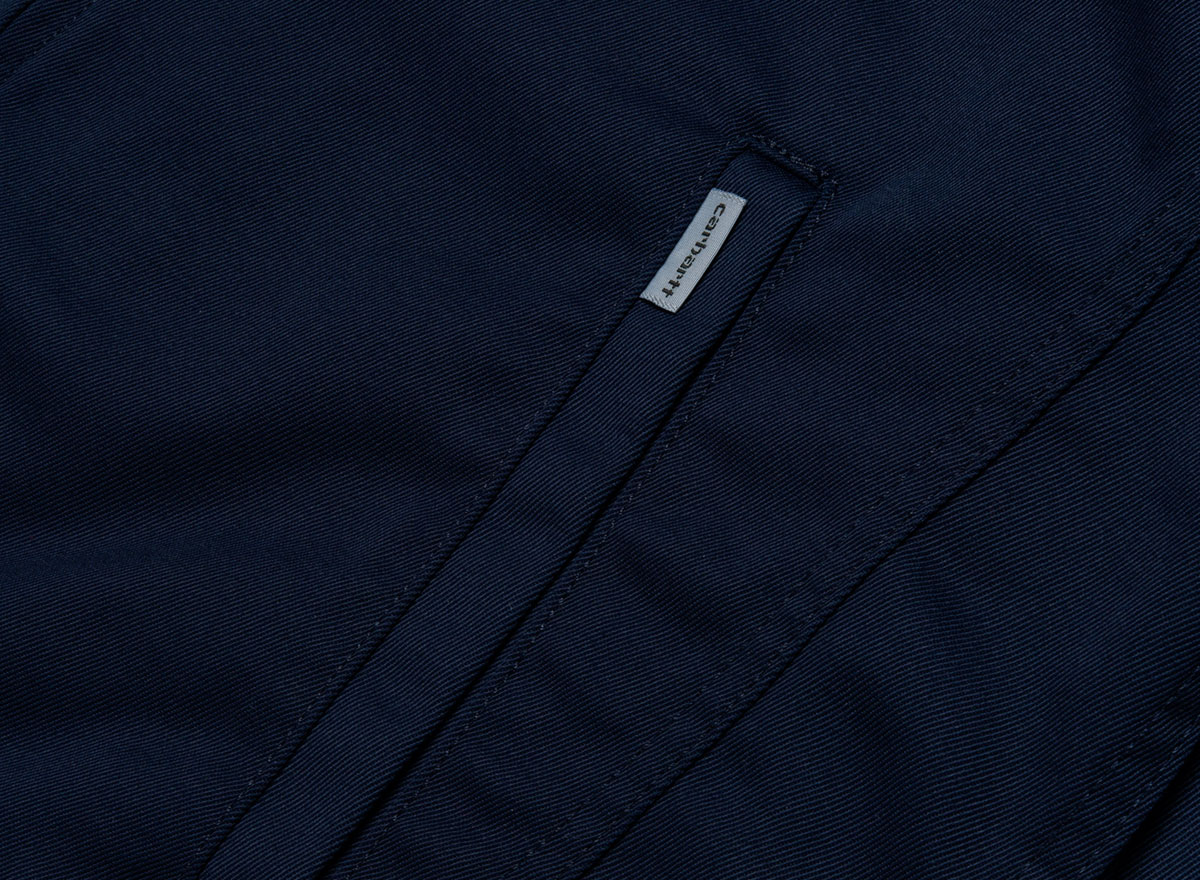 CARHARTT WIP Modular Jacket Navy I022956. Joli blouson non doublé coupe droite en twill lavé 65% coton / 35% polyester 8,8oz. Fermeture zippée. Poignets et bas ajustables. Deux poches sur le bas avec petit logo "Flag".