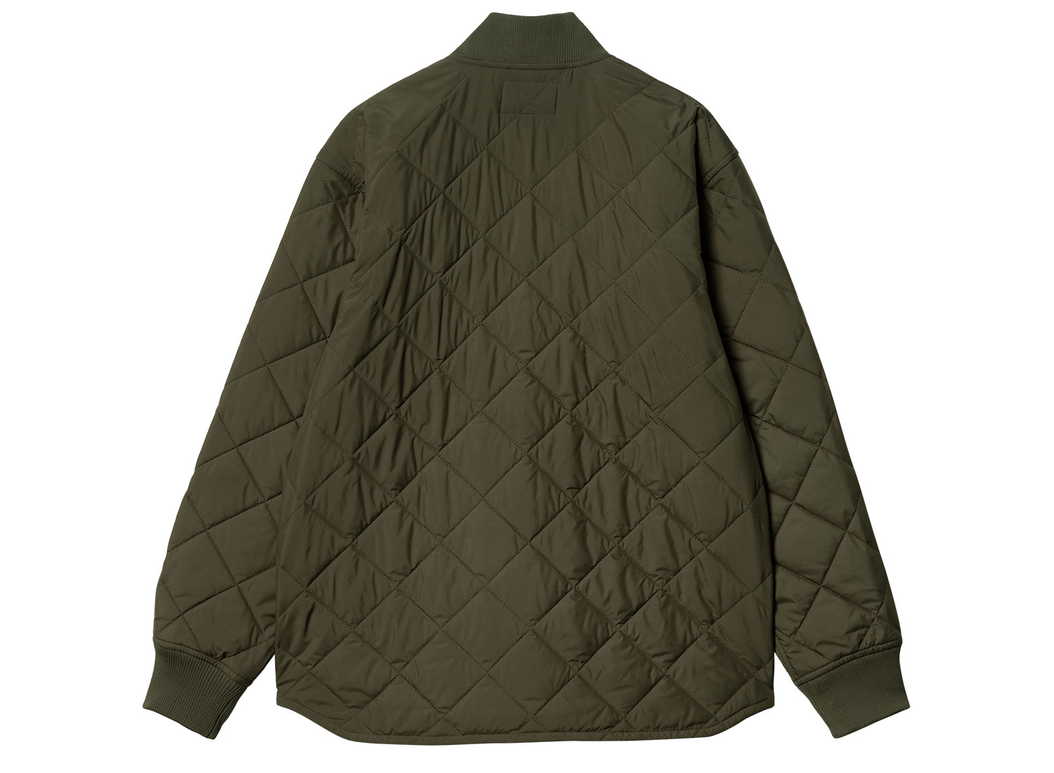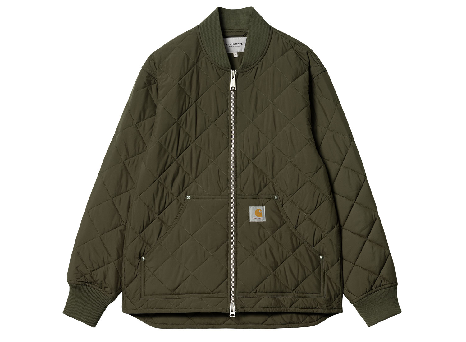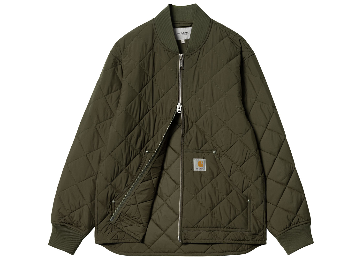 CARHARTT WIP Myton Liner Office Green I033856. Liner confectionné en taffetas de polyester recyclé. Tissu déperlant. Doublure matelassée légèrement rembourré. Col et poignets côtelés. Poche kangourou avec rivets métalliques. Fermeture zippée. Square Label.