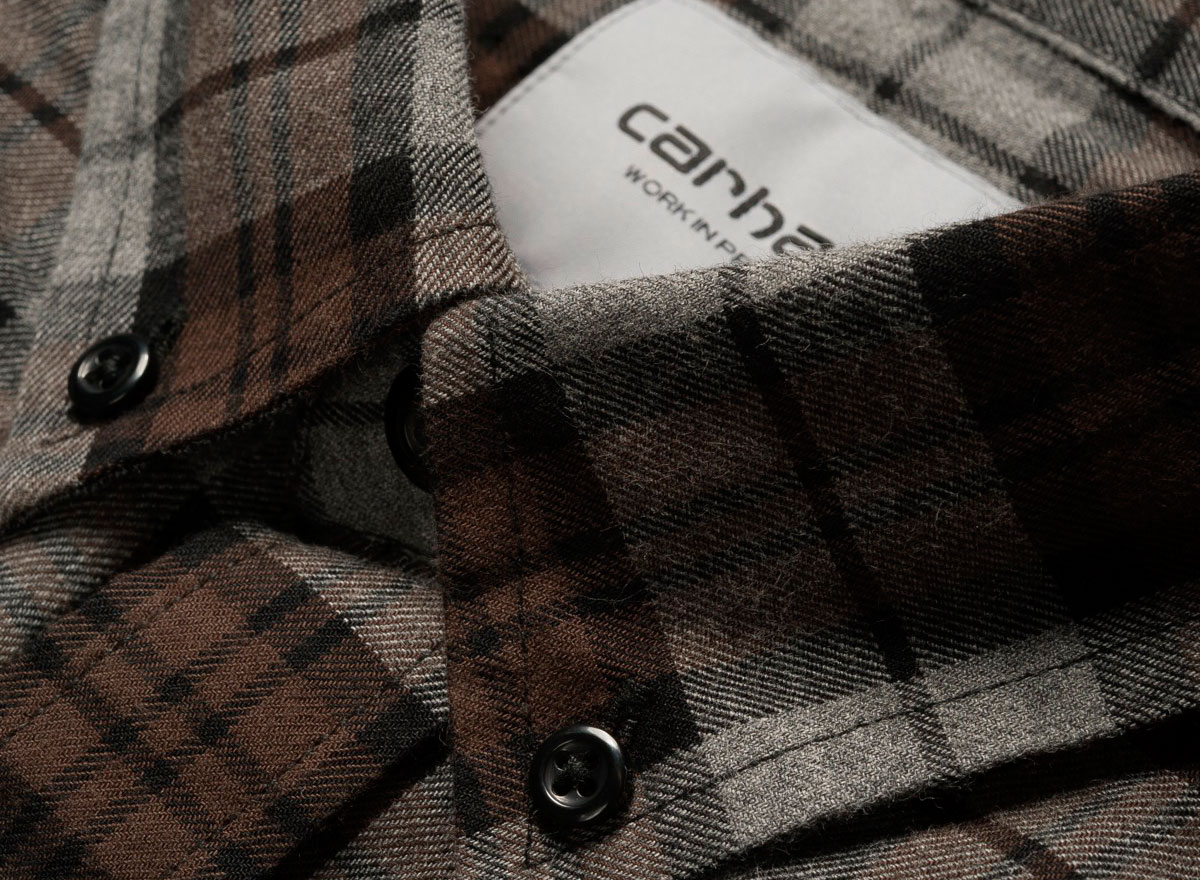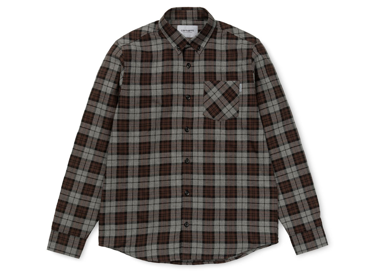 CARHARTT WIP Norton Shirt Dark Grey. Chemise carreaux flanelle de coton. Coupe droite. Une poche poitrine. Col et poignets boutonnés. Découpe arrondie sur le bas.