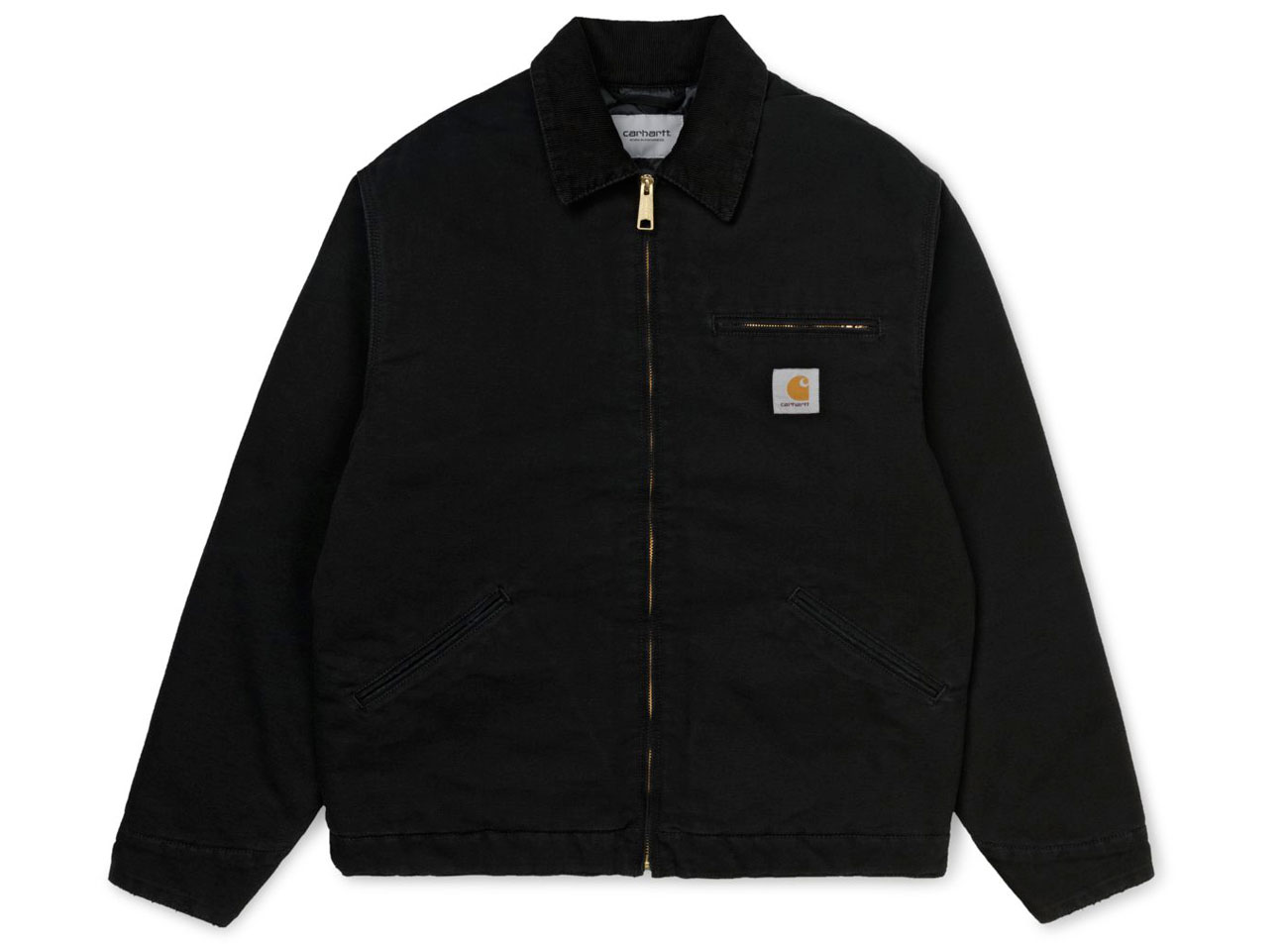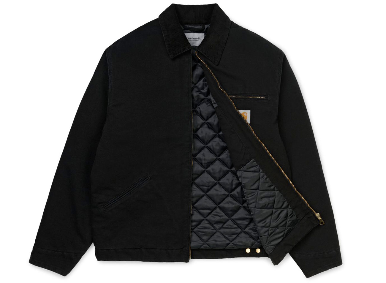 CARHARTT WIP OG Detroit Jacket Black I027358. Toile 'Dearborn' 100 % coton biologique, 12 onces. Coupe ample originale. Doublé en matelassage à motif losanges. Triples coutures. Col montant en velours côtelé. Fermeture avant zippée. Boutons-pression personnalisés et fermeture zippée au milieu à l'avant. Poignets et bord inférieur ajustables. Poche de poitrine avec fermeture zippée. Étiquette carrée.