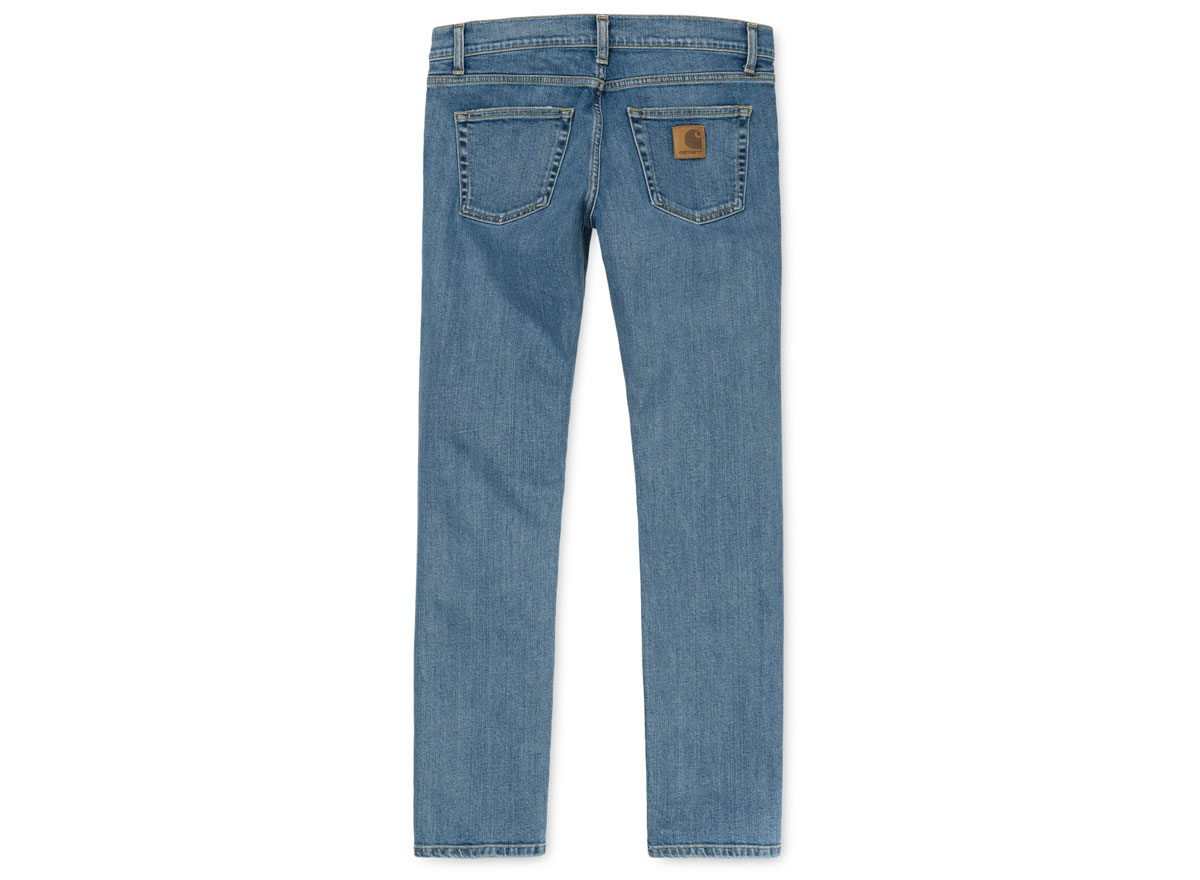 CARHARTT WIP Rebel Pant Blue Stone Washed. Pantalon 5 poches coupe carotte ajustée en denim délavé 98% coton / 2% Élasthanne. 11,75oz. Braguette zippée. Coutures de renforts. Empiècement au dos. Patch cuir.