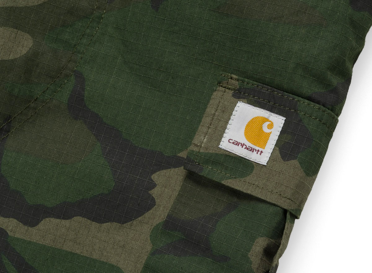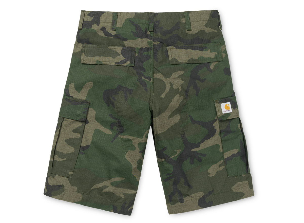 CARHARTT WIP Regular Cargo Short Camo Laurel Rinsed I015999. Short Cargo coupe regular en ripstop 100% coton. Braguette zippée. Renforts aux endroits particulièrement sollicités. Étiquette carrée.