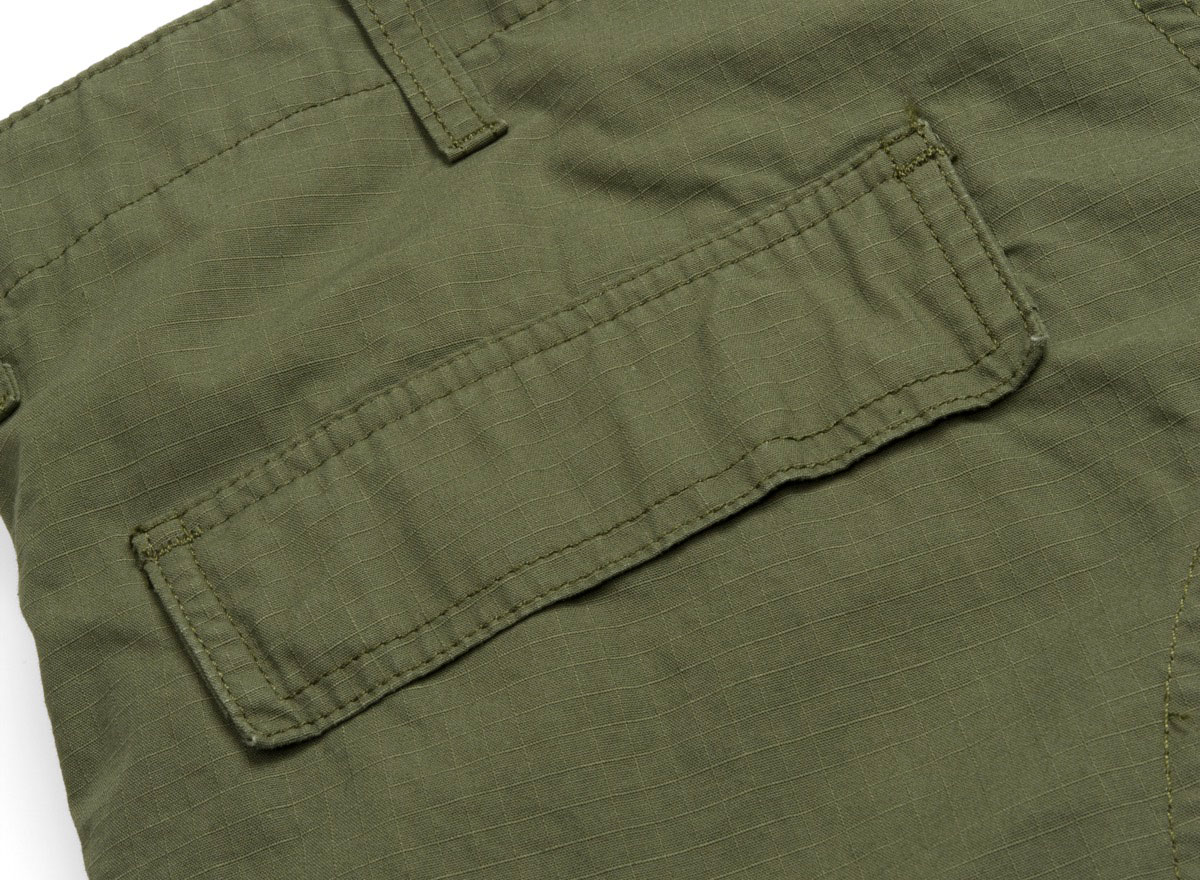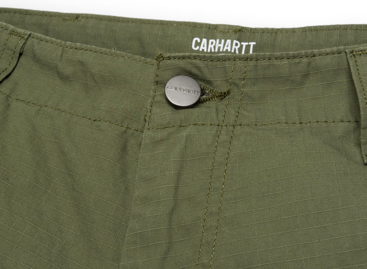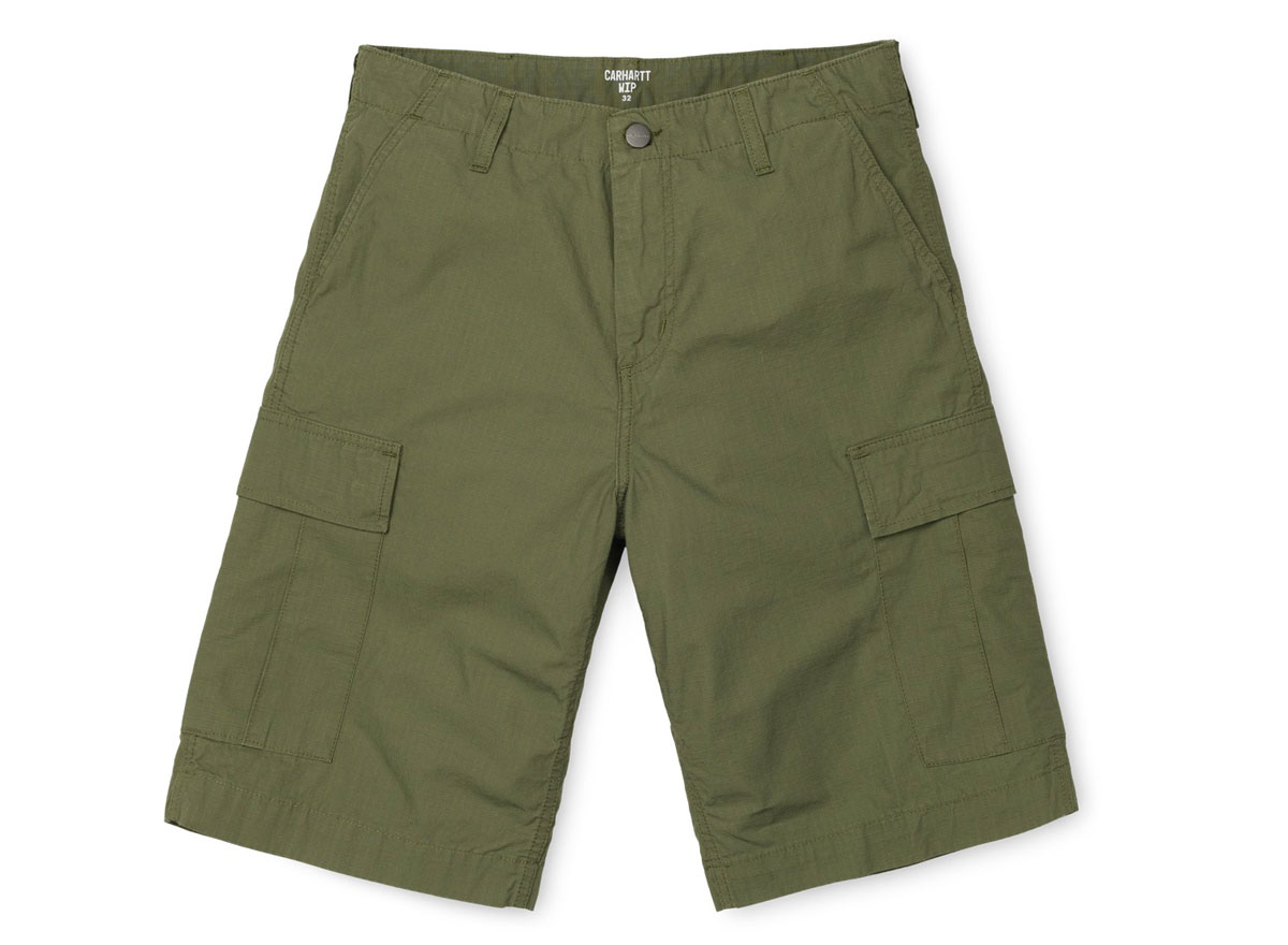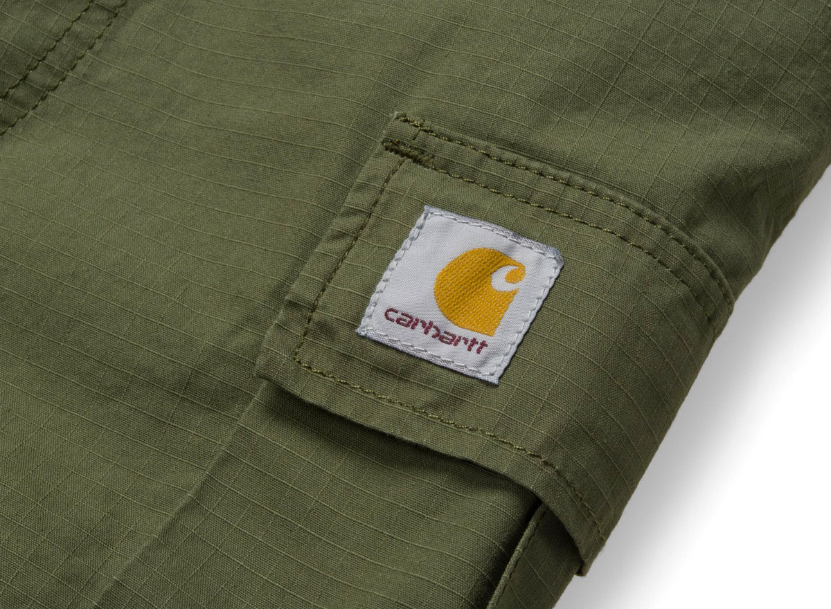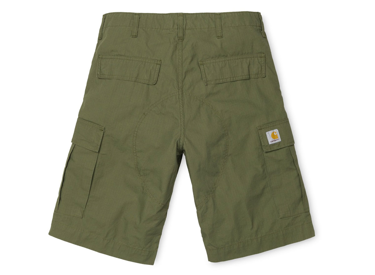 CARHARTT WIP Regular Cargo Short Dollar Green. Short Cargo coupe regular en ripstop 100% coton. Braguette zippée. Renforts aux endroits particulièrement sollicités. Étiquette carrée.