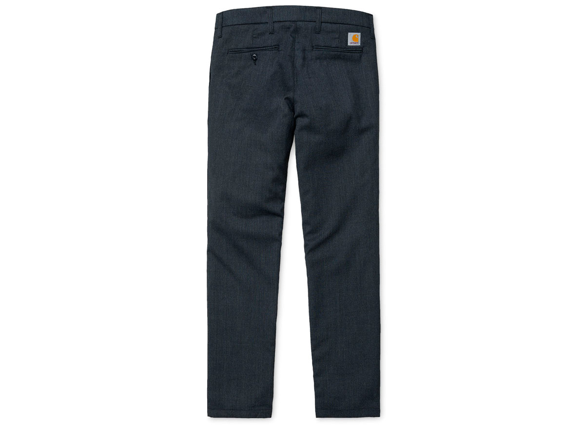 CARHARTT WIP Sid Pant Navy Heather. Chino coupe Slim en Twill 55% Laine / 43% Polyester / 2% Lycra© 'Fargo' Stretch. Taille basse. Braguette zippée. Deux poches côtés et deux passepoilées à l'arrière. "Square Label" cousu au dos.