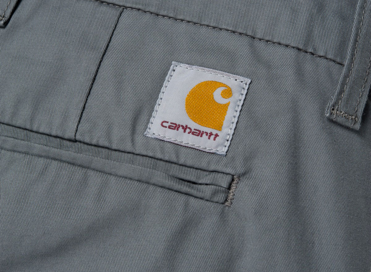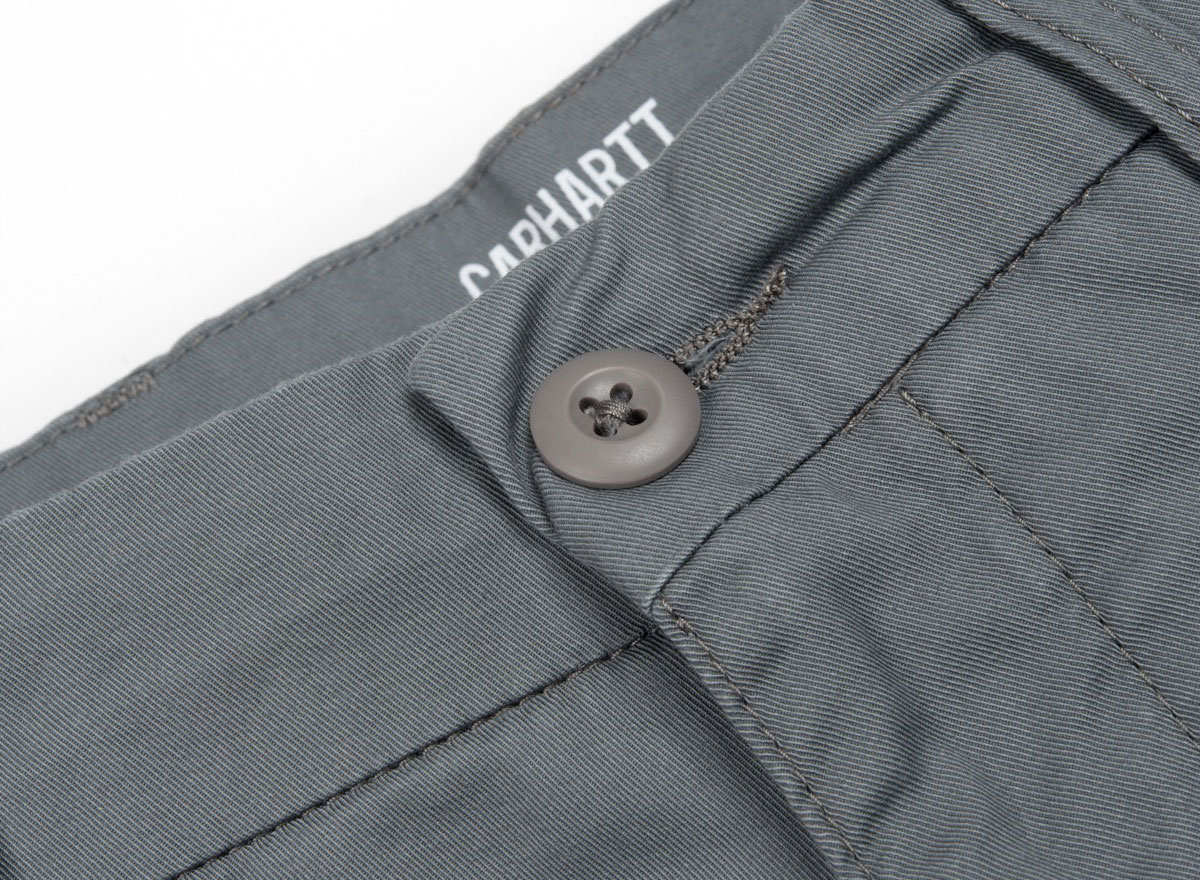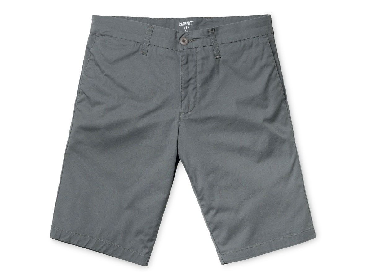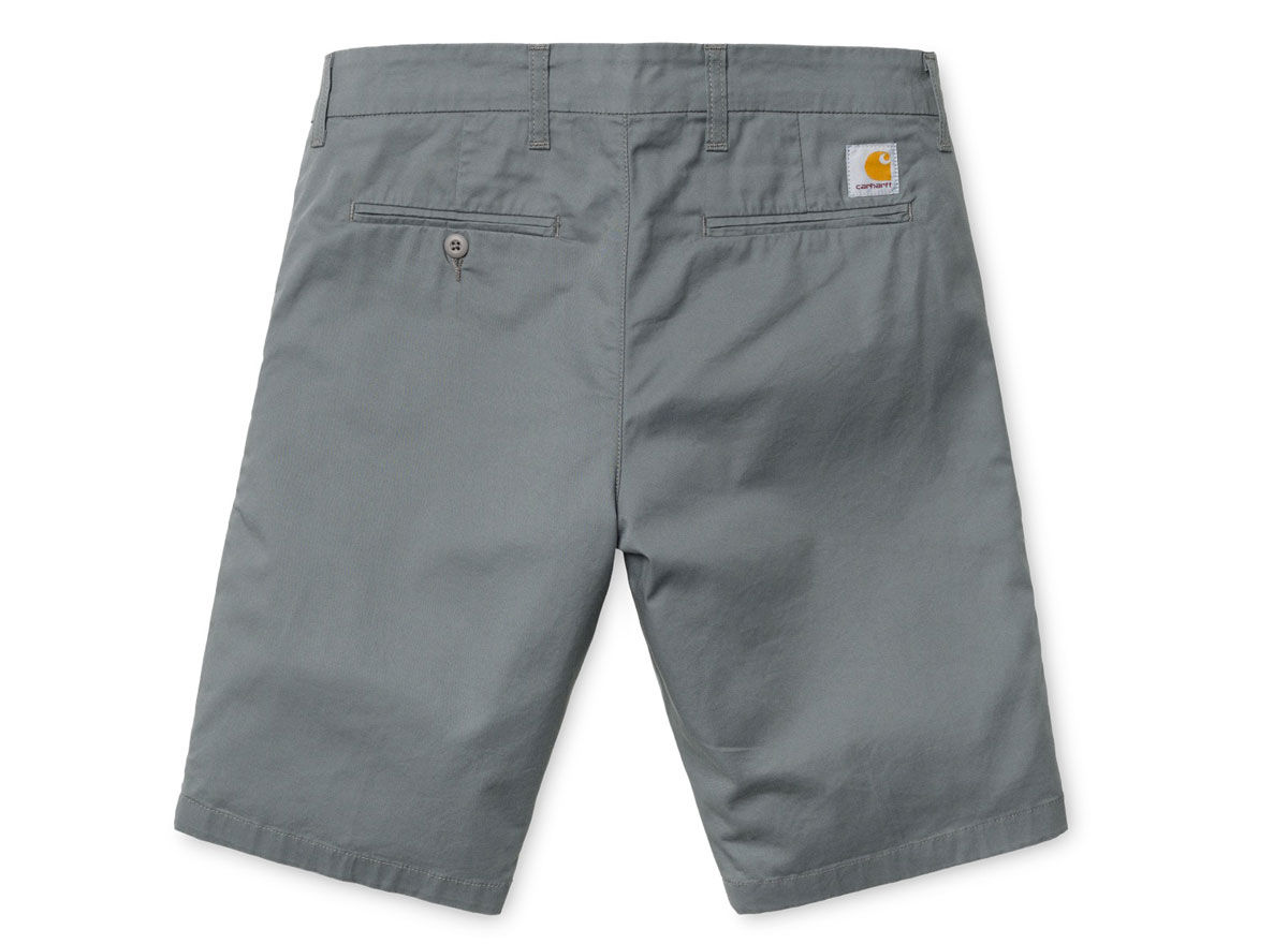 CARHARTT WIP Sid Short Tin. Short chino en twill "Trabuuco" Stretch 6oz. 97% Coton/ 3% Lycra. Coupe slim, taille basse. Coutures de renfort. Étiquette "Square" à l'arrière. Braguette zippée. Deux poches côtés et deux à l'arrière.